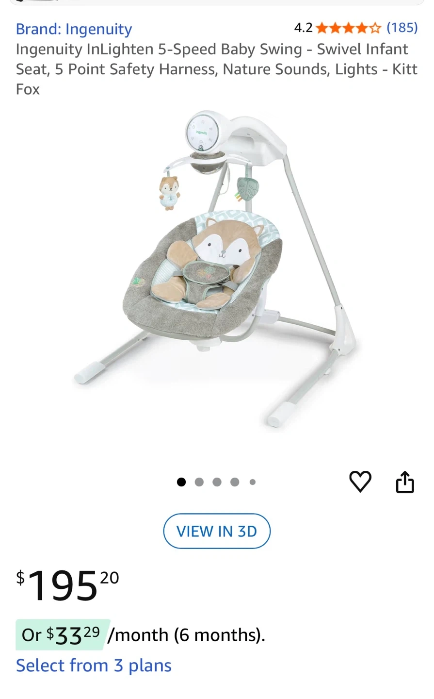 Selling an Ingenuity InLighten 5-Speed Baby Swing. It features a swivel infant seat, a 5-point safety harness, nature sounds, and lights. The design is the adorable Kitt Fox!