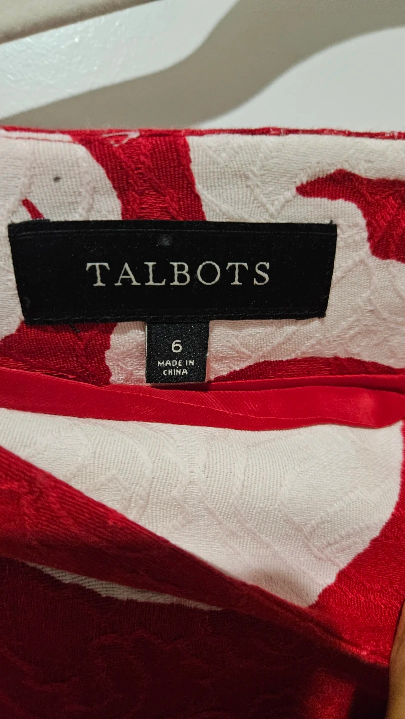 Talbots pencil skirt in a vibrant red with a contrasting cream floral print. It's a size 6, made in China. The textured fabric adds a unique touch to the classic silhouette.