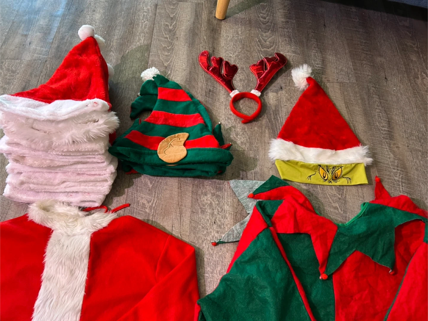 This lot includes several Christmas-themed costume pieces. You'll find a Santa suit jacket with trim (one size fits all up to 2X), a green and red elf suit (one size fits all up to 3X), 12 Santa hats, 3 elf hats, one Grinch Santa hat, and a pair of reindeer antlers. Perfect for holiday parties or festive events!