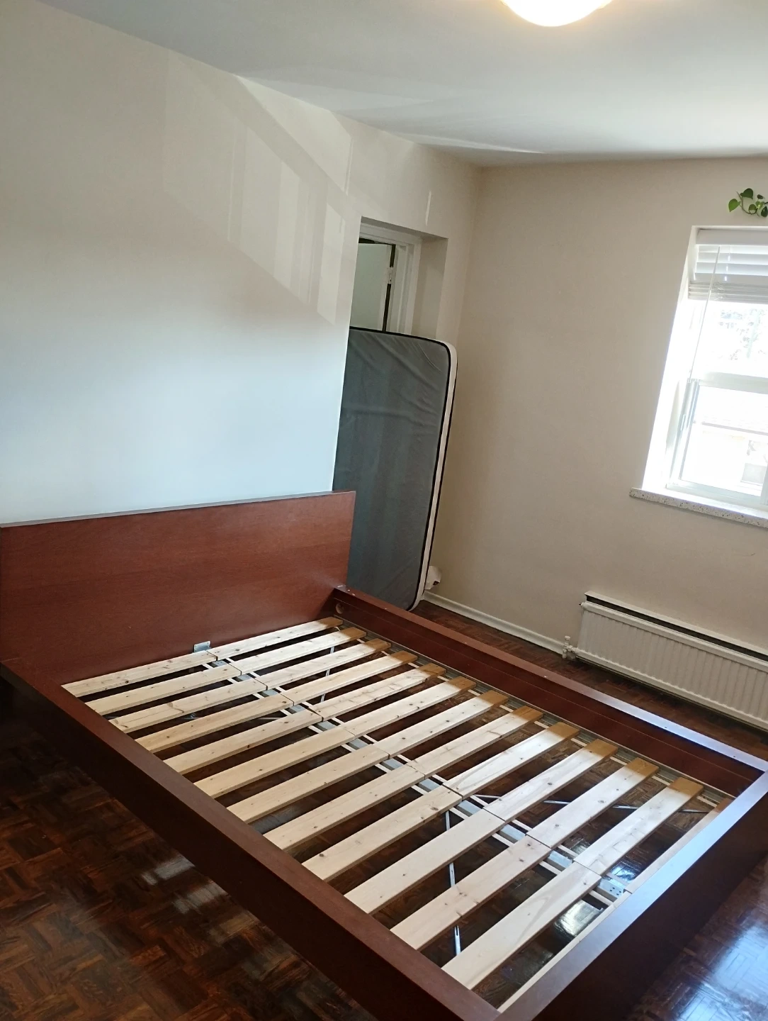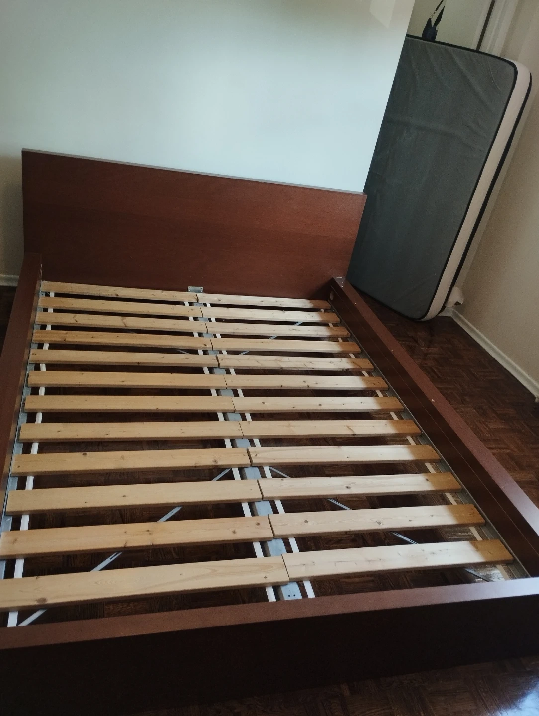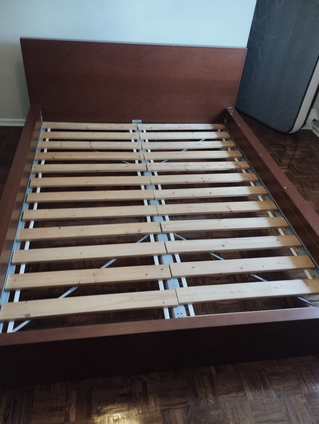 Queen size bed frame in a dark wood finish. Includes wooden slats for mattress support. Bed frame is made of wood. This bed frame is a good option for any bedroom.