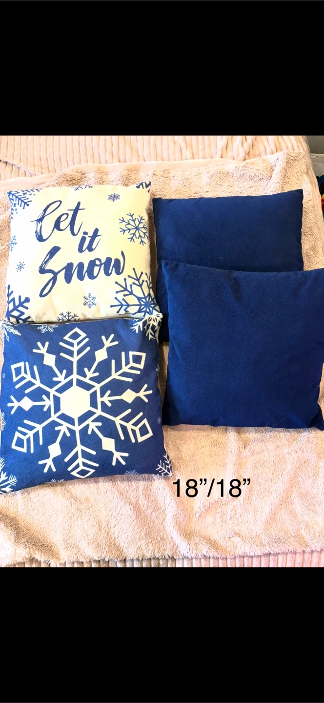 Two decorative throw pillows featuring snowflake designs and the phrase 'Let it Snow' on a white background. Two solid navy blue pillows also included. Pillows measure 18 inches by 18 inches.