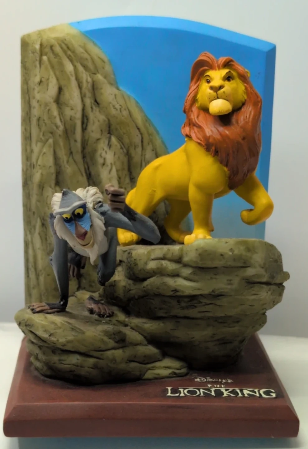 These decorative bookends feature characters from Disney's The Lion King, including Mufasa, Rafiki, Simba, and Pumbaa. They are made of a durable material and designed to hold books. These are for decorative use only and not for young children.item is in excellent condition all question are welcome.