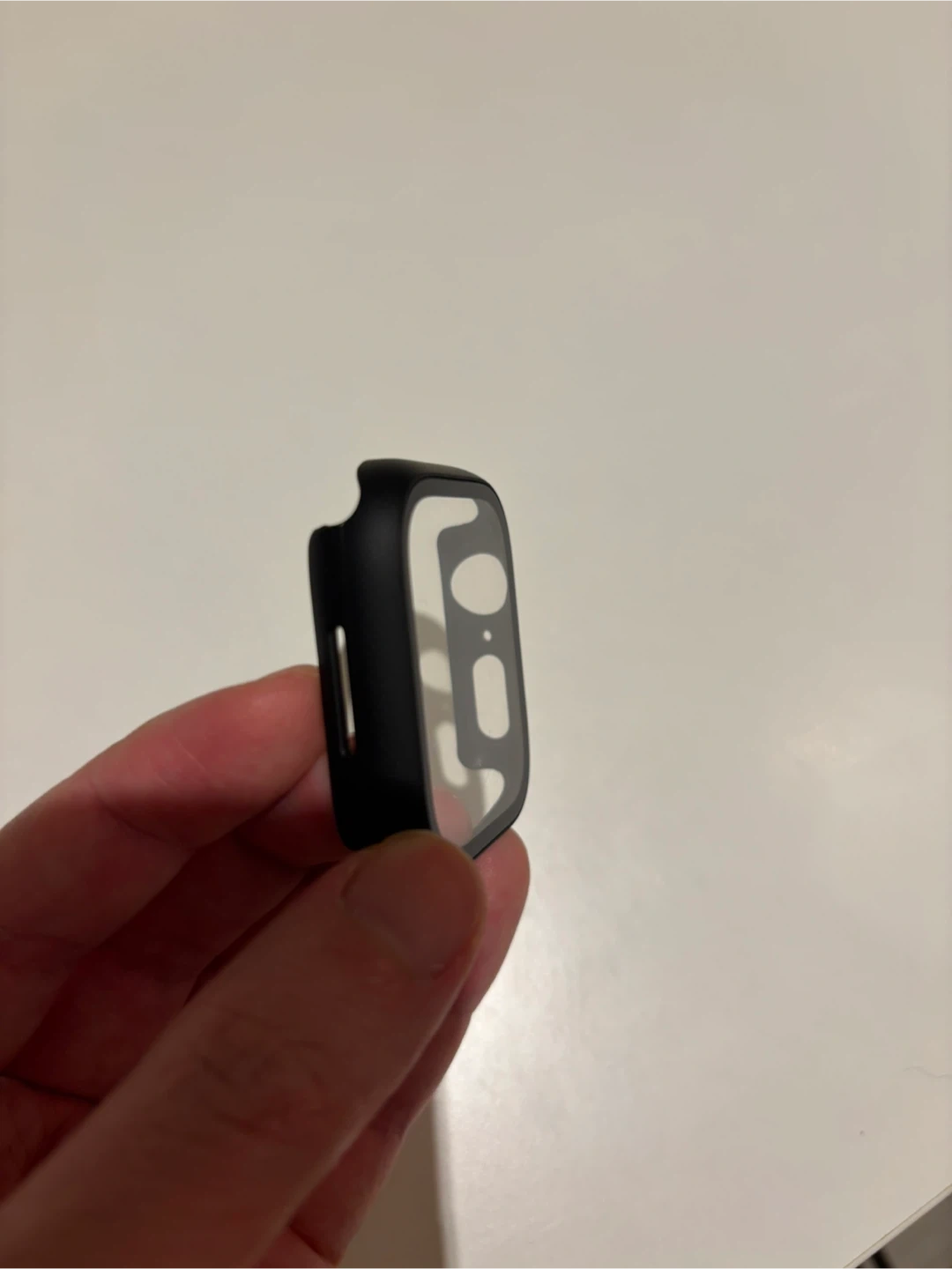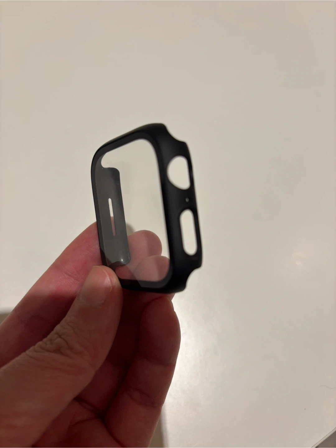 This is a black protective case for an Apple Watch 45mm. Guard against scratches and bumps to the screen. Snap-on design.