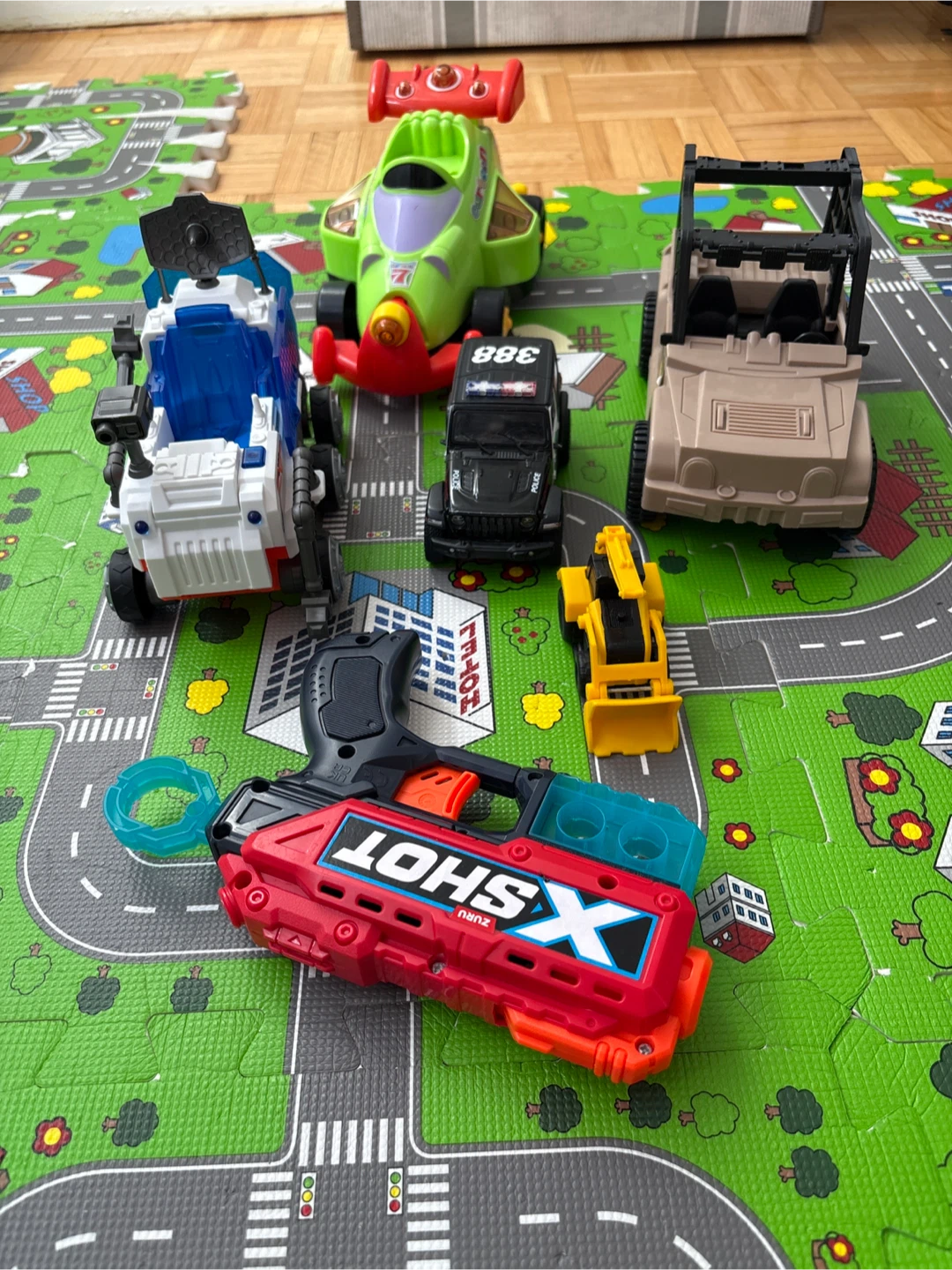 This is a lot of toy vehicles including a red and blue X-Shot blaster gun. The toy cars are assorted types and colours. Made from plastic.