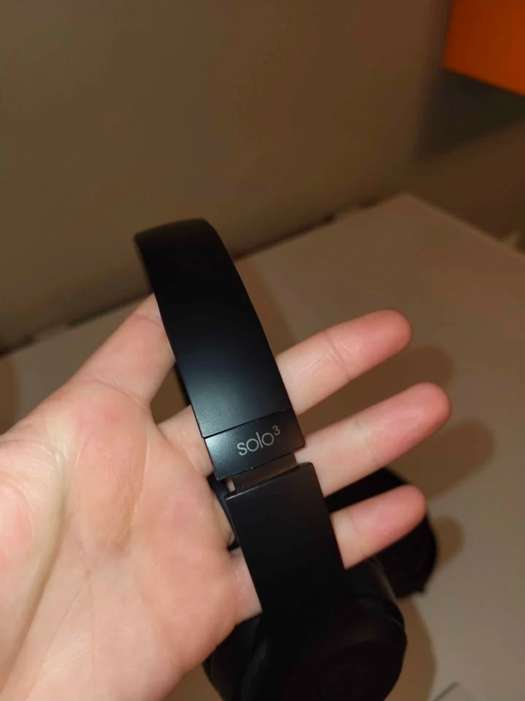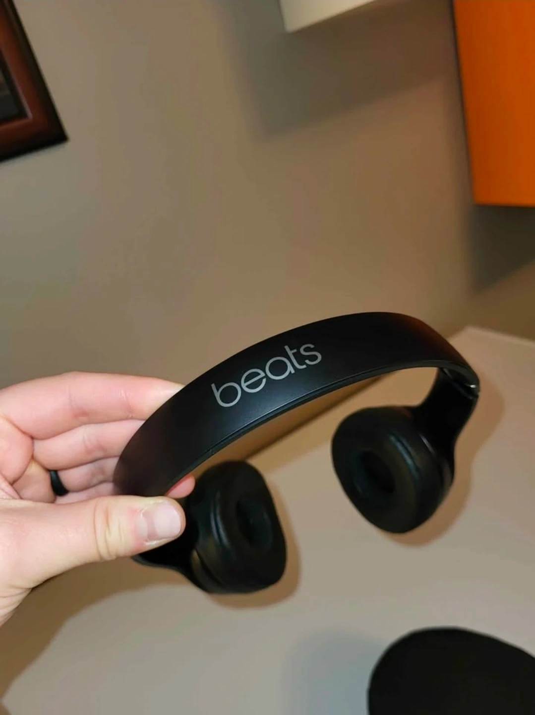 Black Beats Solo3 wireless on-ear headphones. Includes original carrying case. Ear pad foam is exposed on one side.