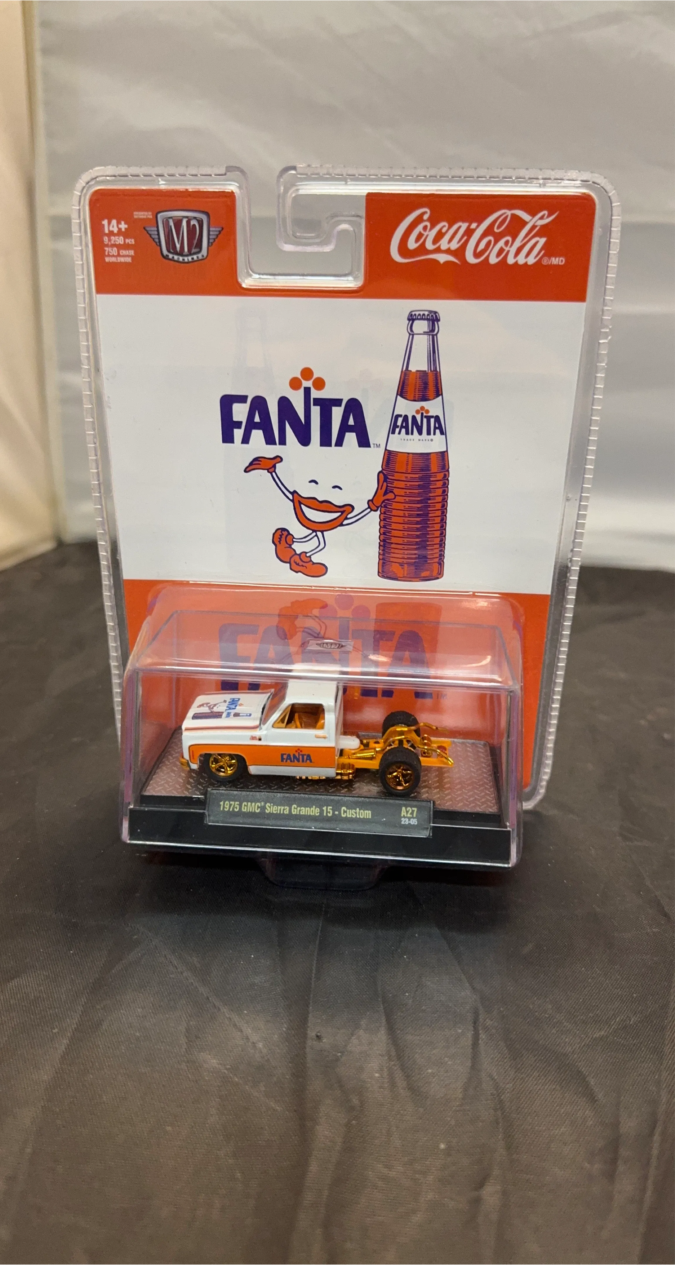 This is an M2 Machines 1975 GMC Sierra Grande 15 - Custom die-cast model. It features a Fanta and Coca-Cola theme. Includes original packaging.