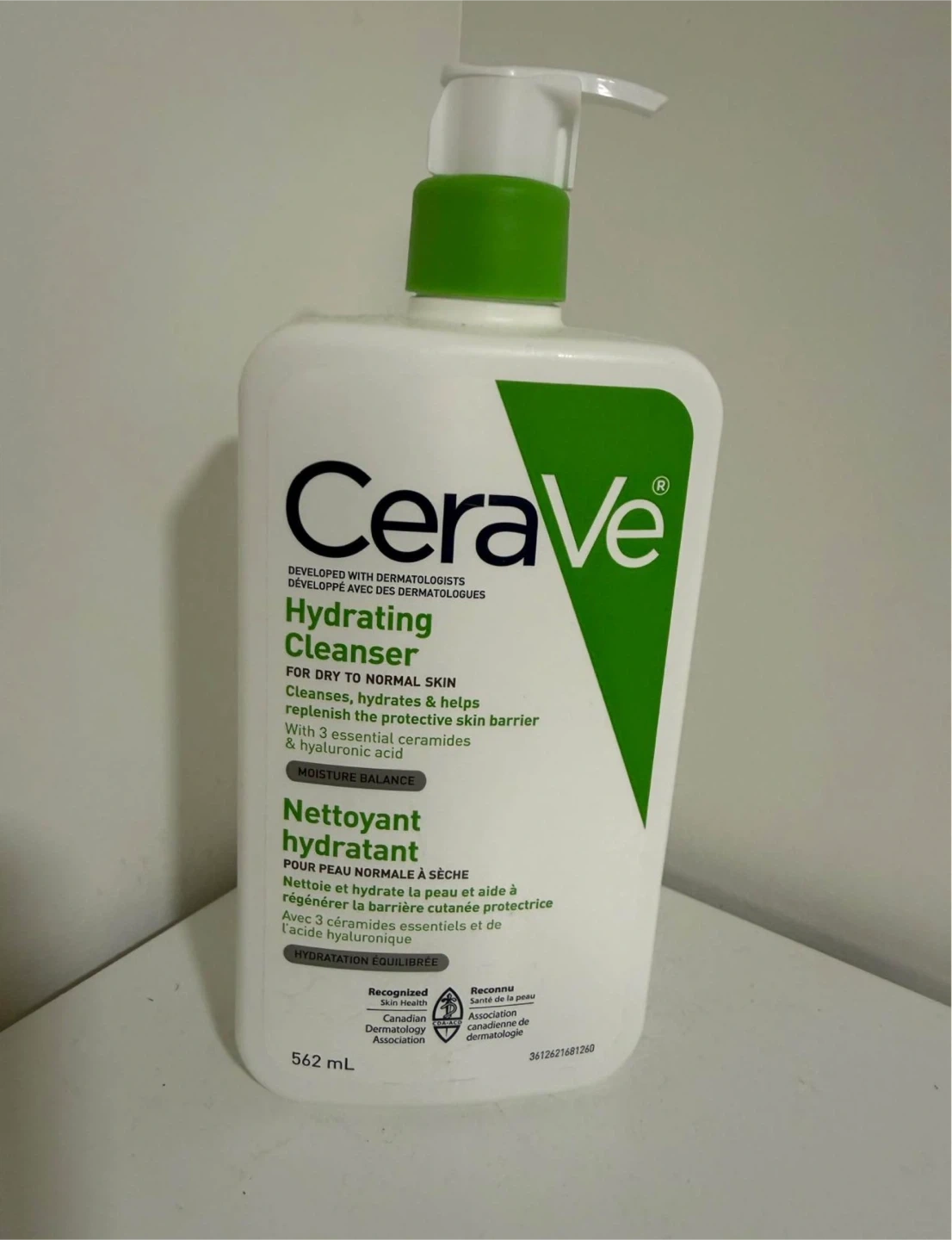 CeraVe Hydrating Cleanser for dry to normal skin. It cleanses, hydrates & helps replenish the protective skin barrier. Contains 3 essential ceramides & hyaluronic acid. 562 mL bottle.