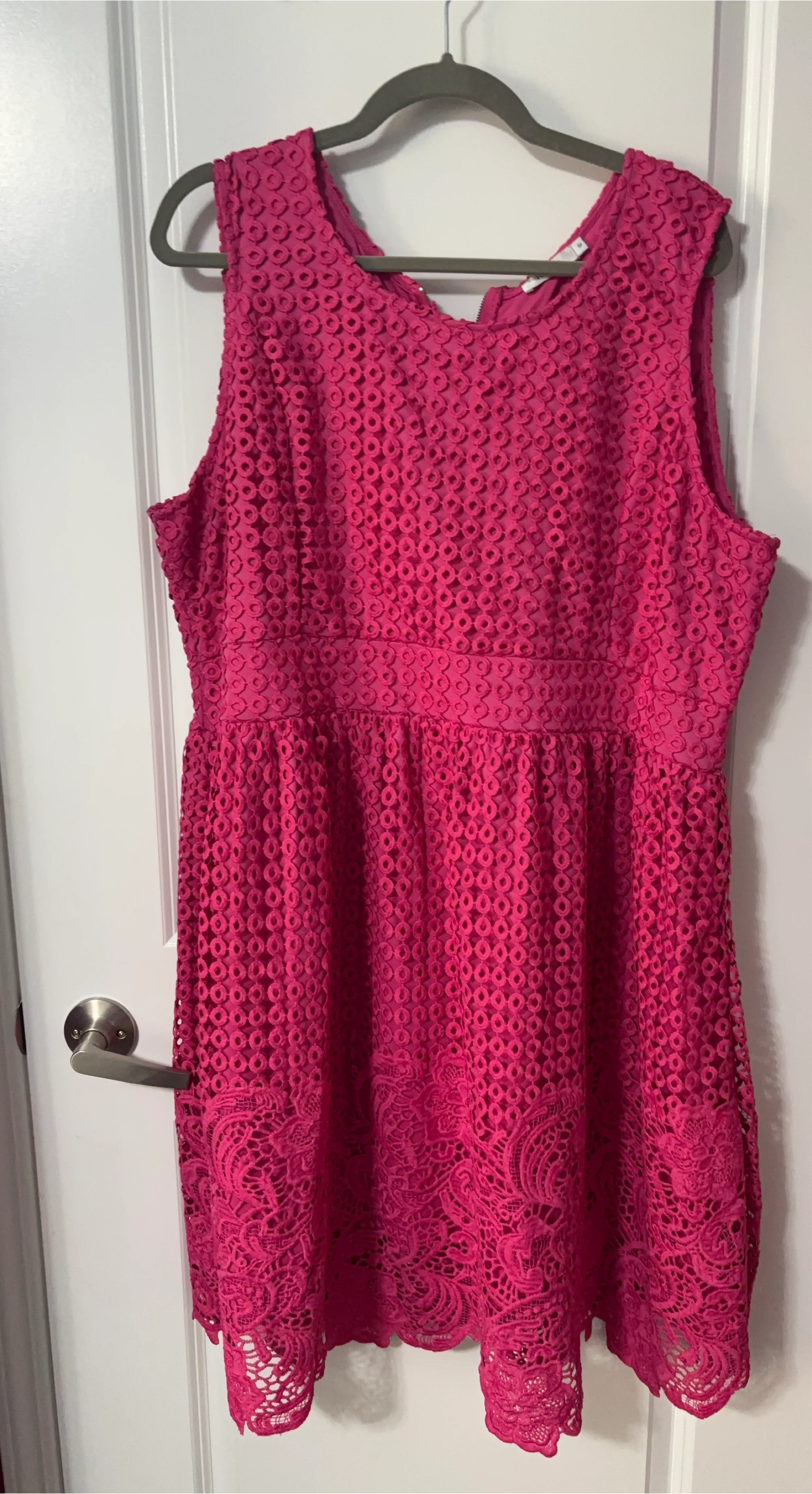 A lovely pink lace dress with a circular cutout pattern. It has a sleeveless design and a zippered back. The hem features a delicate lace trim. Perfect for a summer occasion!
