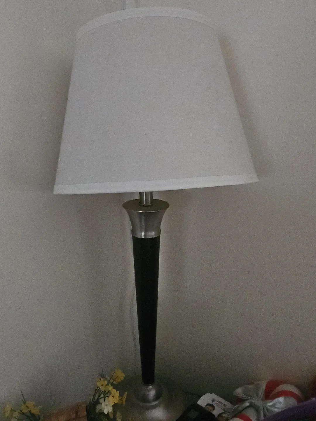 Silver and black table lamp with white shade