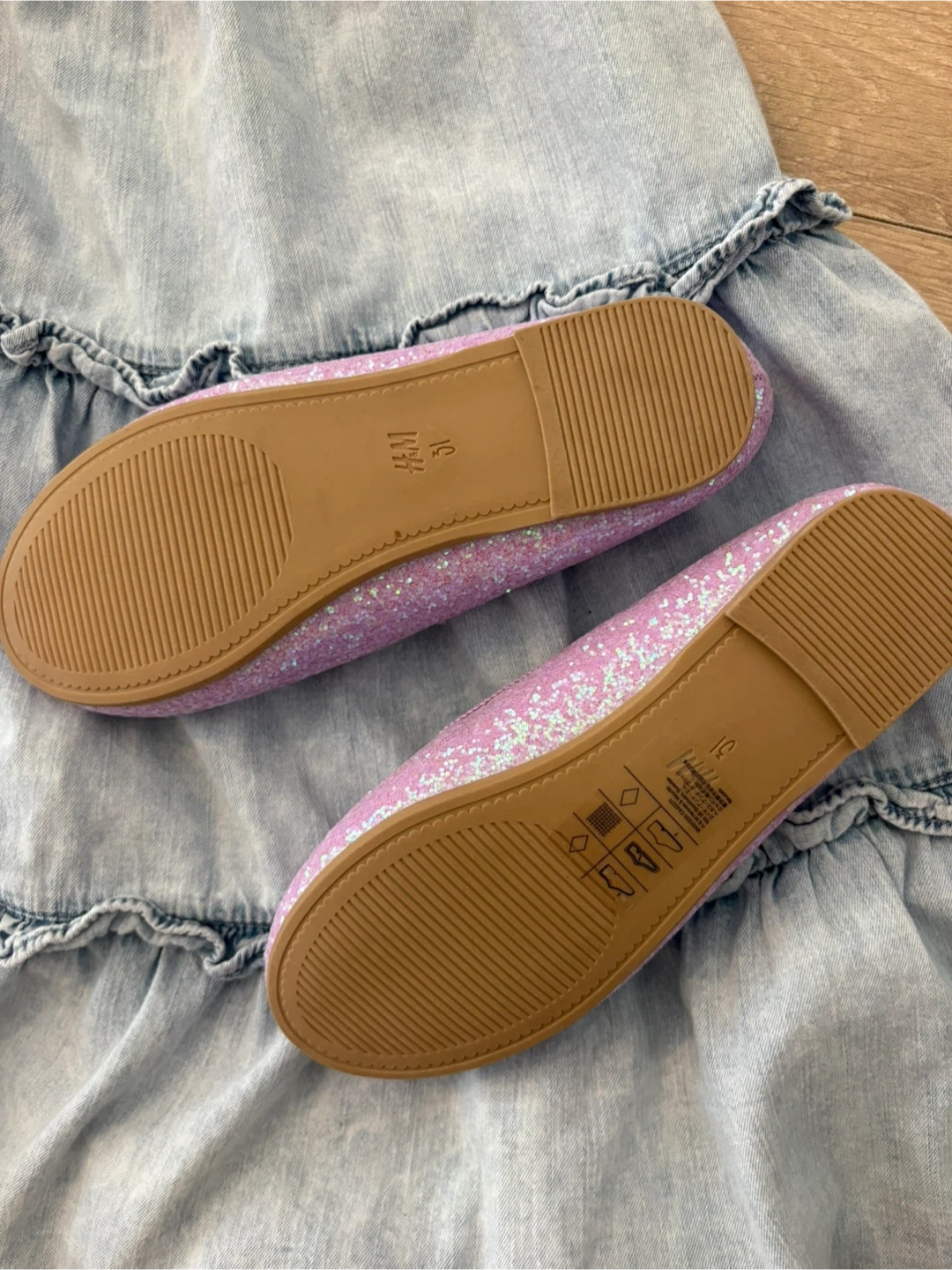 This is a baby Gap denim tiered dress in size 5 years, worn only once. Also included are a new pair of light purple glitter ballet flats in size 31. Pickup Queen and Yonge or Queen and broadview.