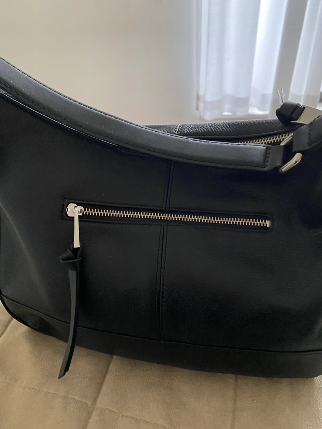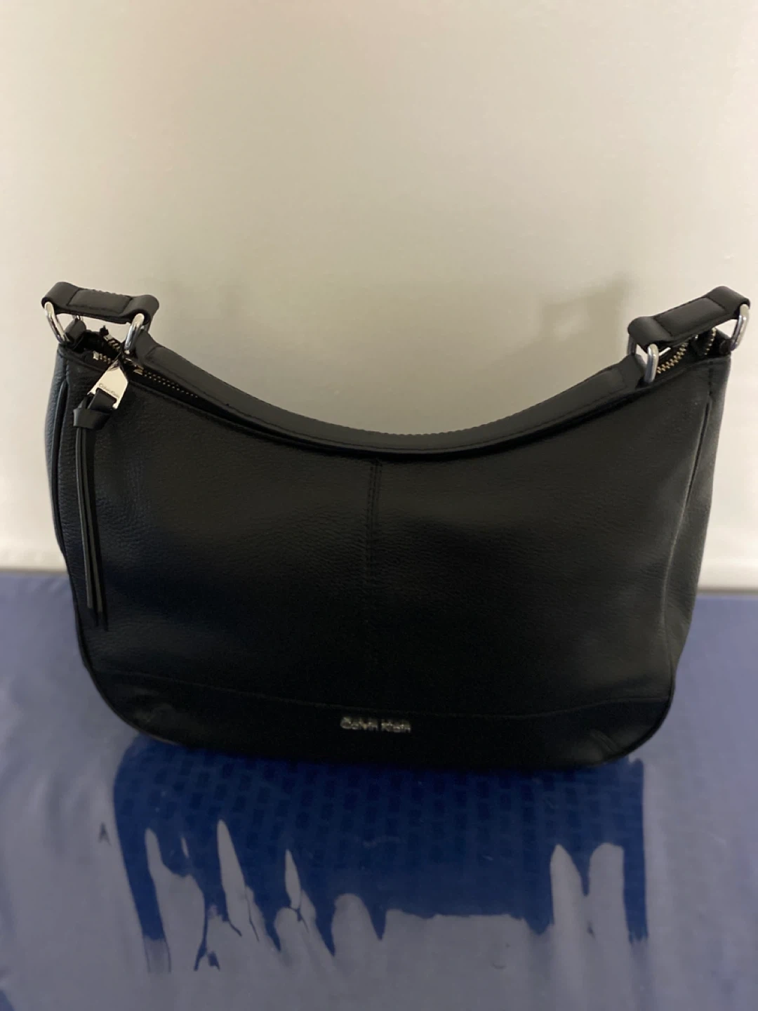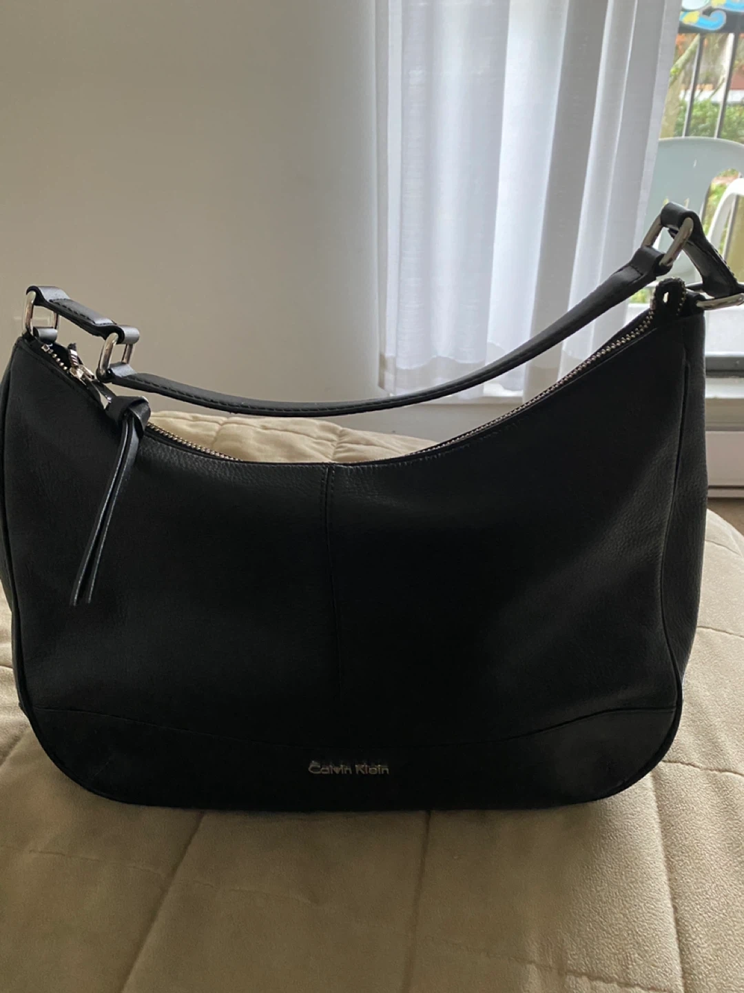 This is a black leather hobo handbag from Calvin Klein. It features a zip closure and an exterior zip pocket. The interior is lined with branded fabric and has a zip pocket. It's a classic accessory that's great for everyday use! Never worn