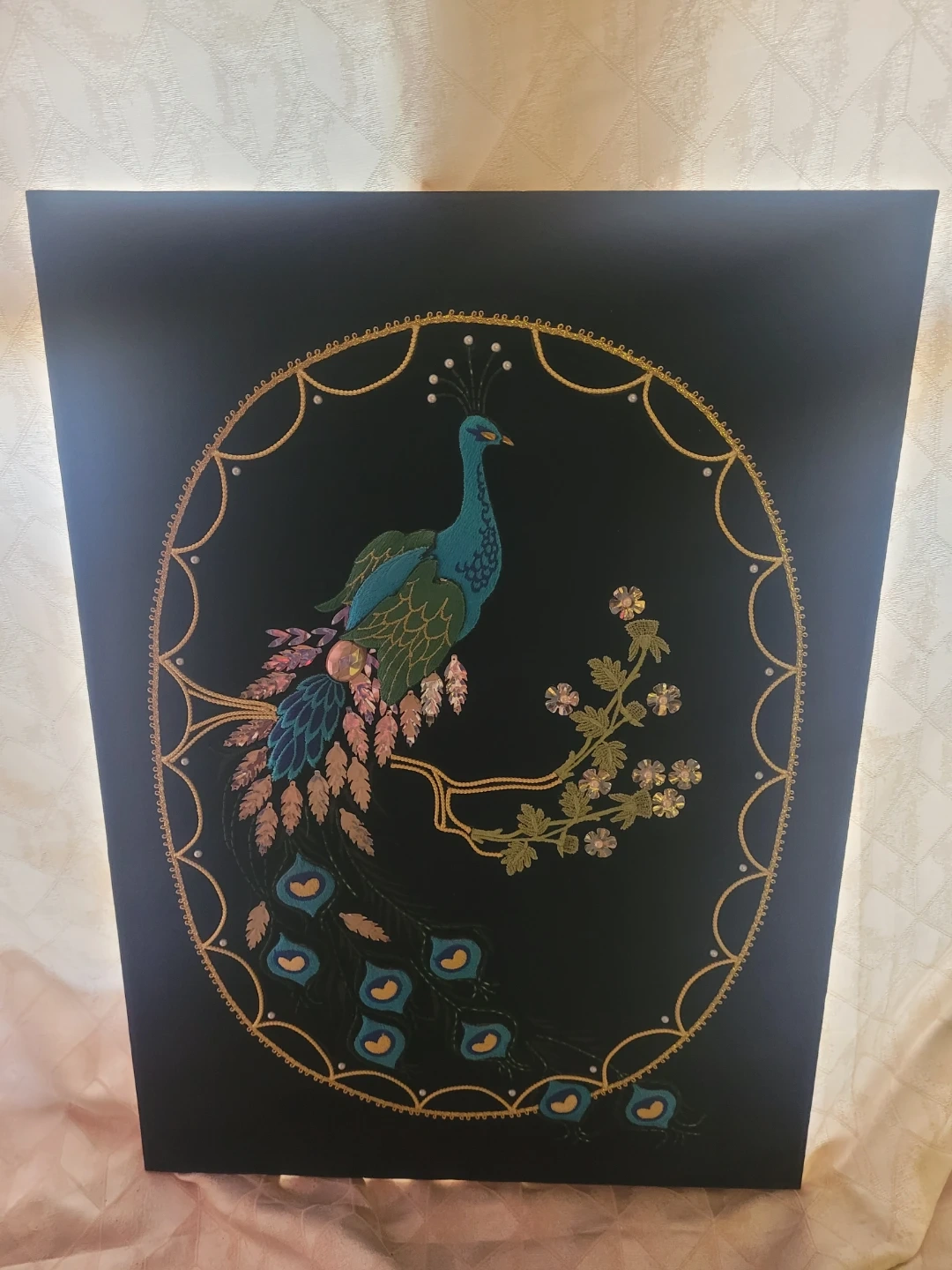 Black velvet wall art featuring a detailed embroidered peacock. Decorative gold trim and bead accents. A stunning piece for your home decor! This piece is vintage and does not include a frame.