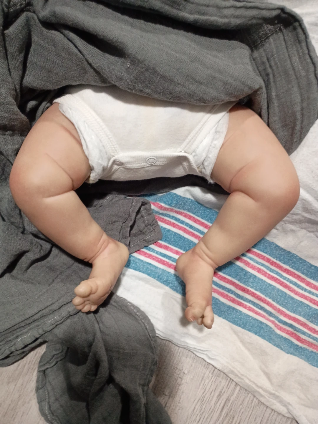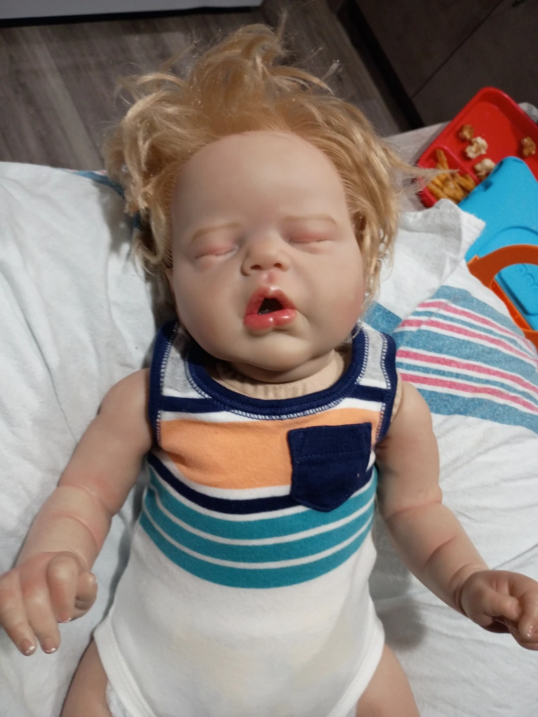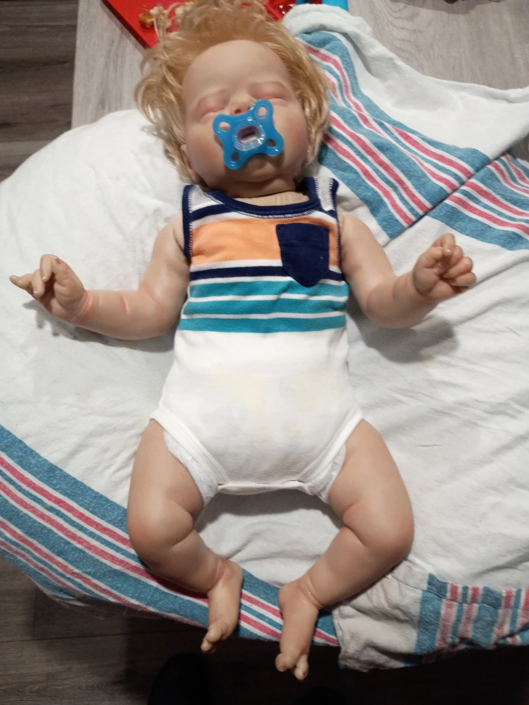 Lifelike reborn baby doll with blonde hair and a blue pacifier. It's wearing a striped tank top onesie. The doll has realistic skin texture and detailed features. It was painted by Alexis by c. Brace it was weighted and modified by me it can take a actual bottle you can give formula but make sure you flush out with water it's a drink and wet it comes with extra outfits and he can take a modified pacifier
