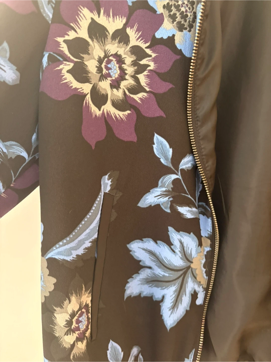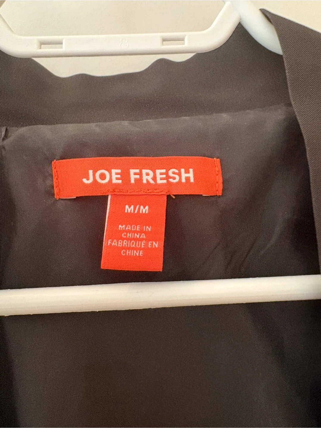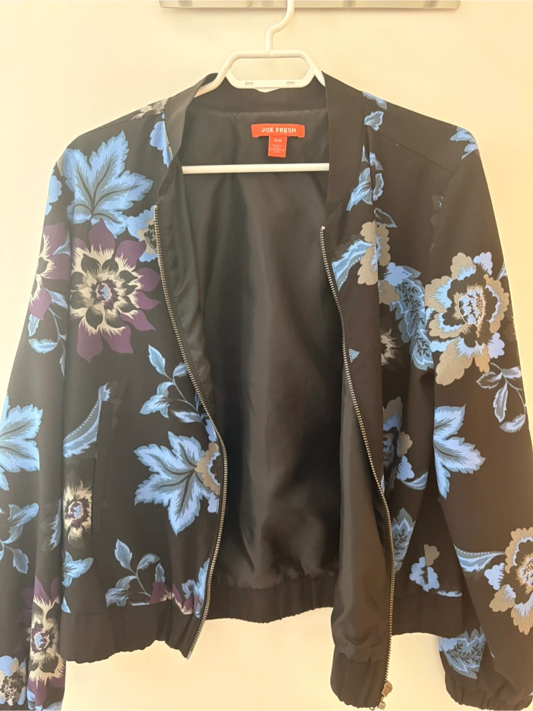 This Joe Fresh bomber jacket features a black base with a colourful floral print. It's a size M/M with a zippered front and two side pockets. A great layering piece for any occasion!