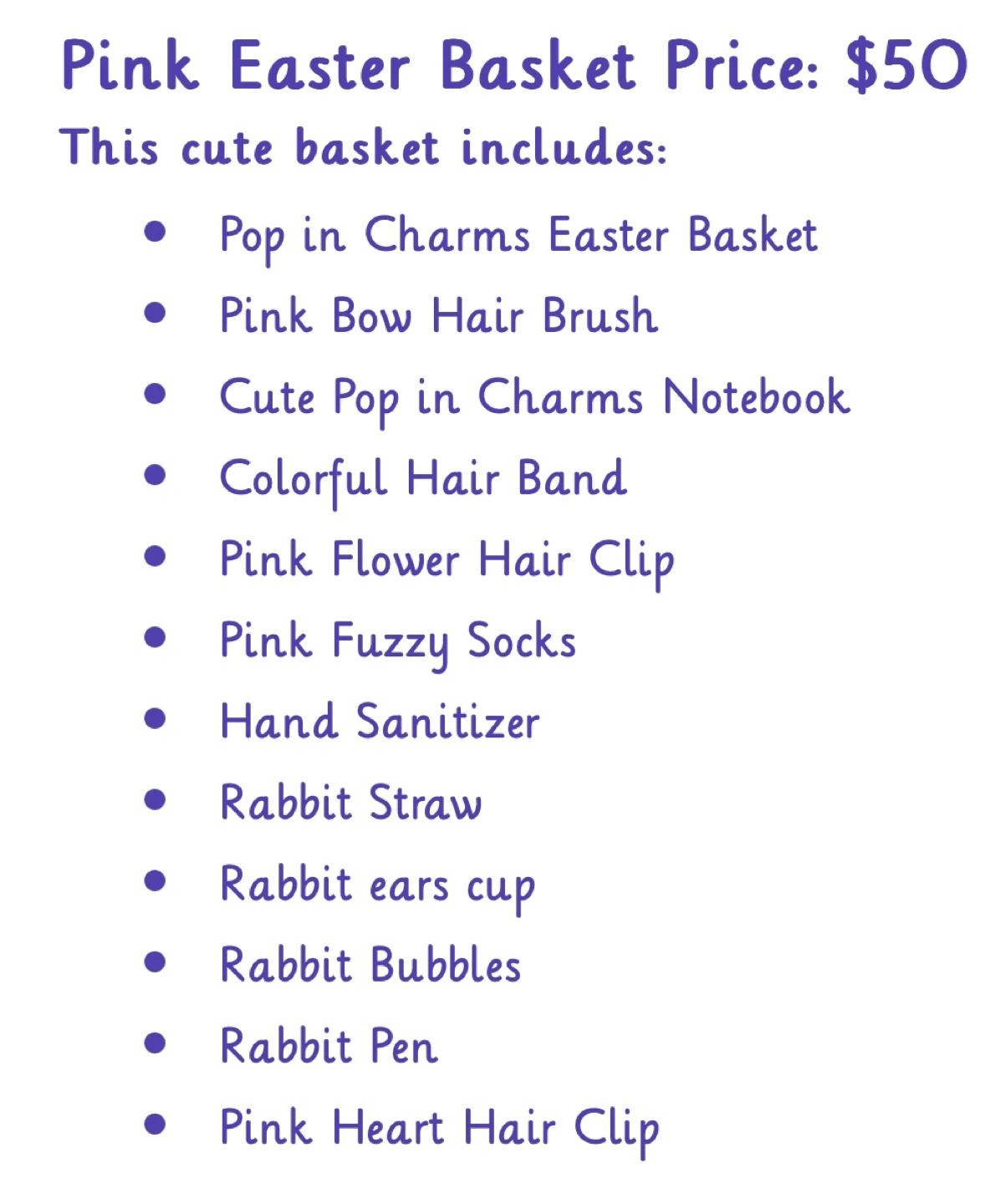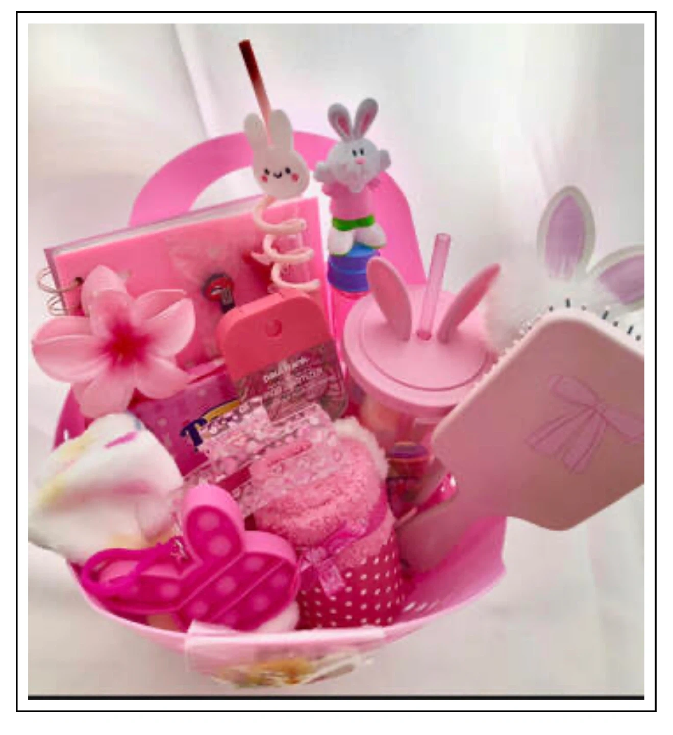 This cute basket is filled with fun items! It includes a Pop in Charms Easter Basket, pink bow hair brush, cute notebook, colourful hair band, pink flower and heart hair clips, pink fuzzy socks, hand sanitizer, rabbit straw, rabbit ears cup, rabbit bubbles, and a rabbit pen. A great collection for Easter!