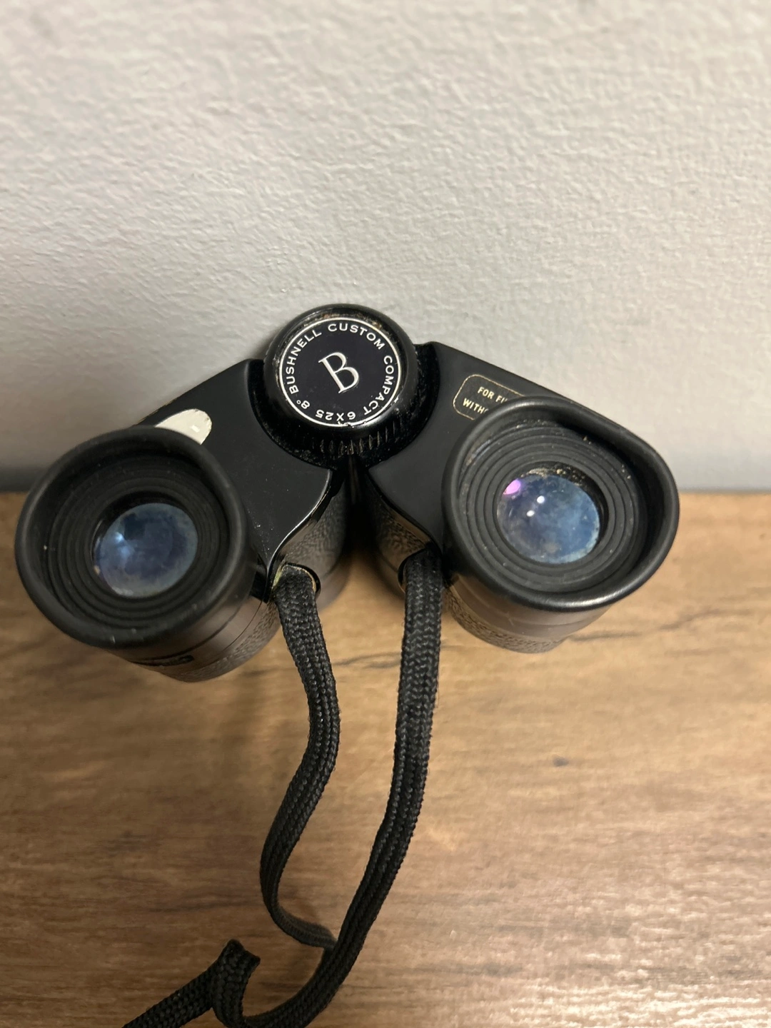 These are Bushnell Custom Compact binoculars with a 6x25 magnification. They are black and come with a neck strap. These binoculars are great for getting a closer look at distant objects.
