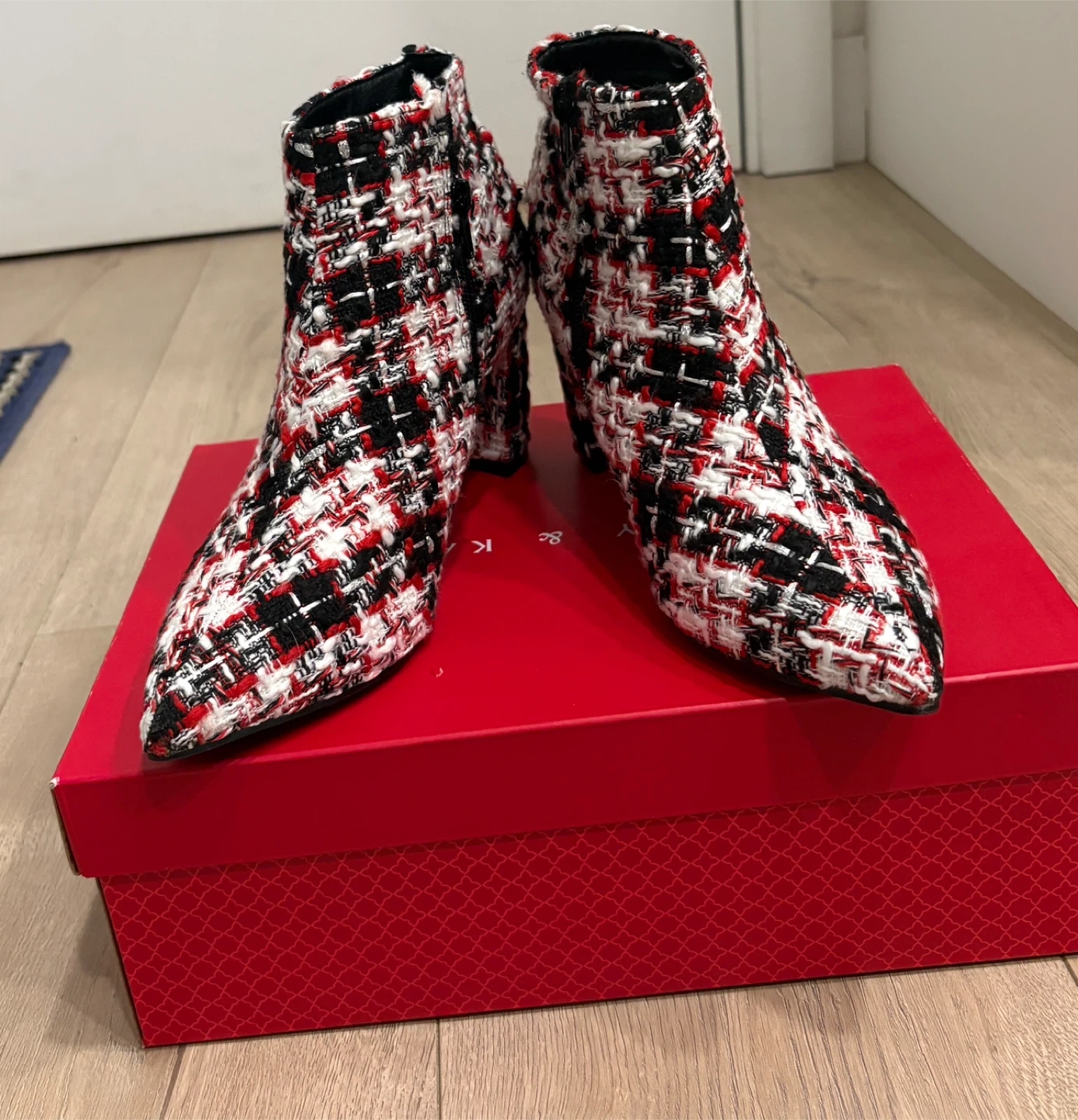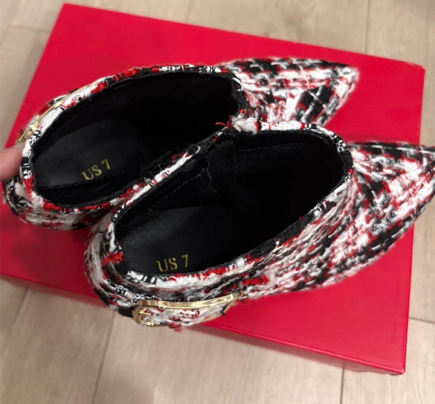 Stylish tweed ankle boots in a black, white, and red pattern. These boots feature a pointed toe, a side buckle accent, and a chunky block heel. They come in a US size 7. These boots would add a pop of pattern to any outfit!