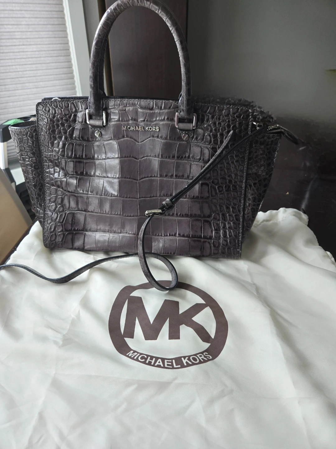 A stylish Michael Kors satchel tote in a dark grey colour with a crocodile embossed texture. It's made of leather and includes a dust bag for storage. Plenty of interior pockets to keep your essentials organized!