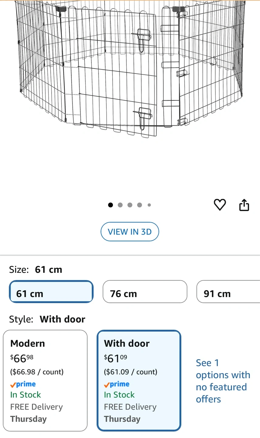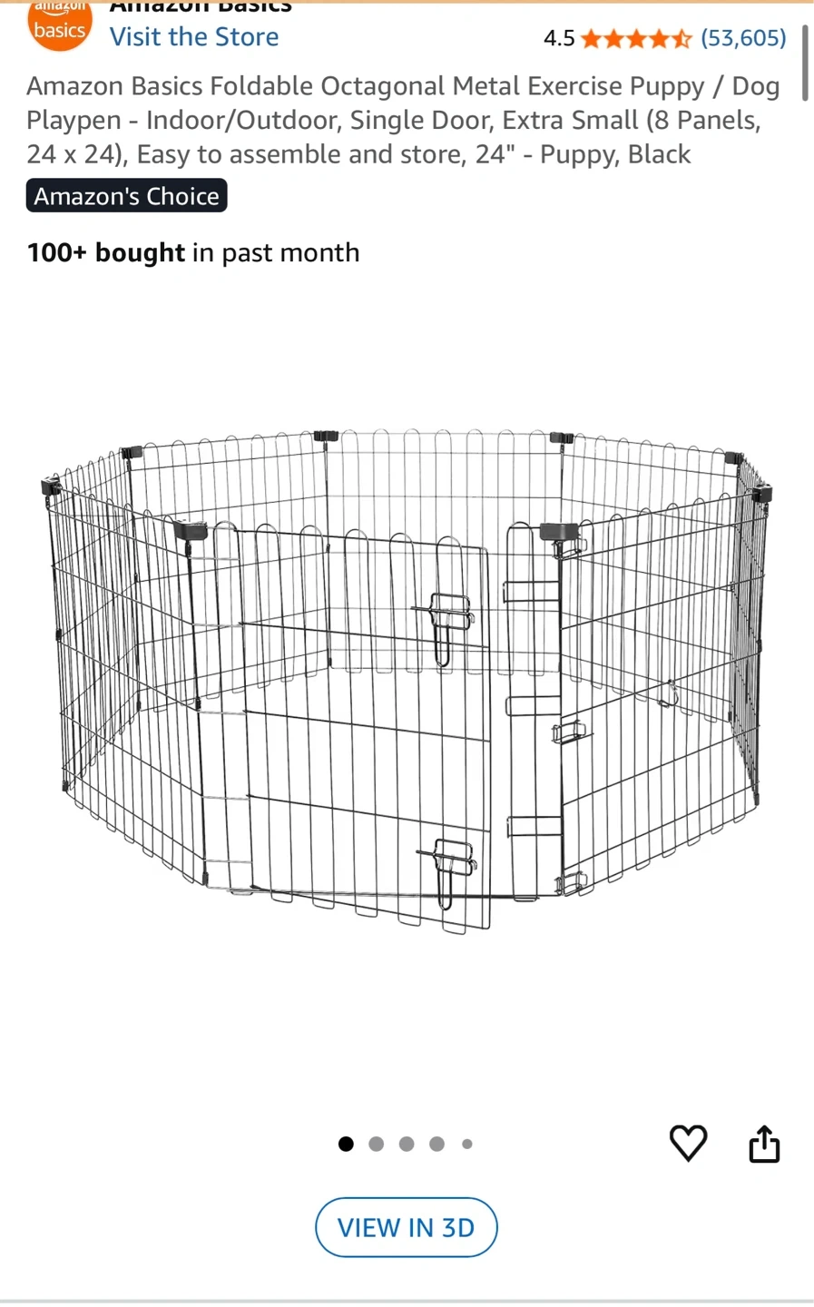 Amazon Basics foldable octagonal metal exercise puppy/dog playpen. This indoor/outdoor playpen has a single door and is 24 inches tall. It's easy to assemble and store.