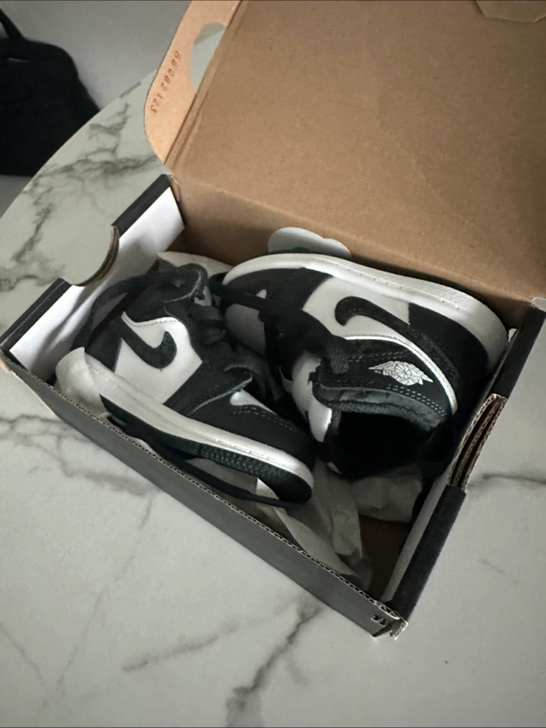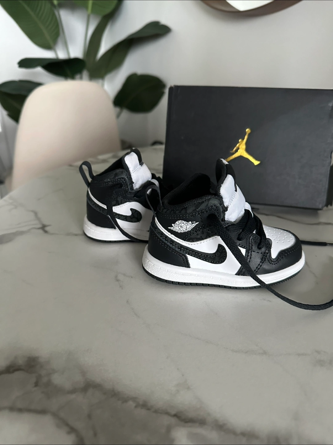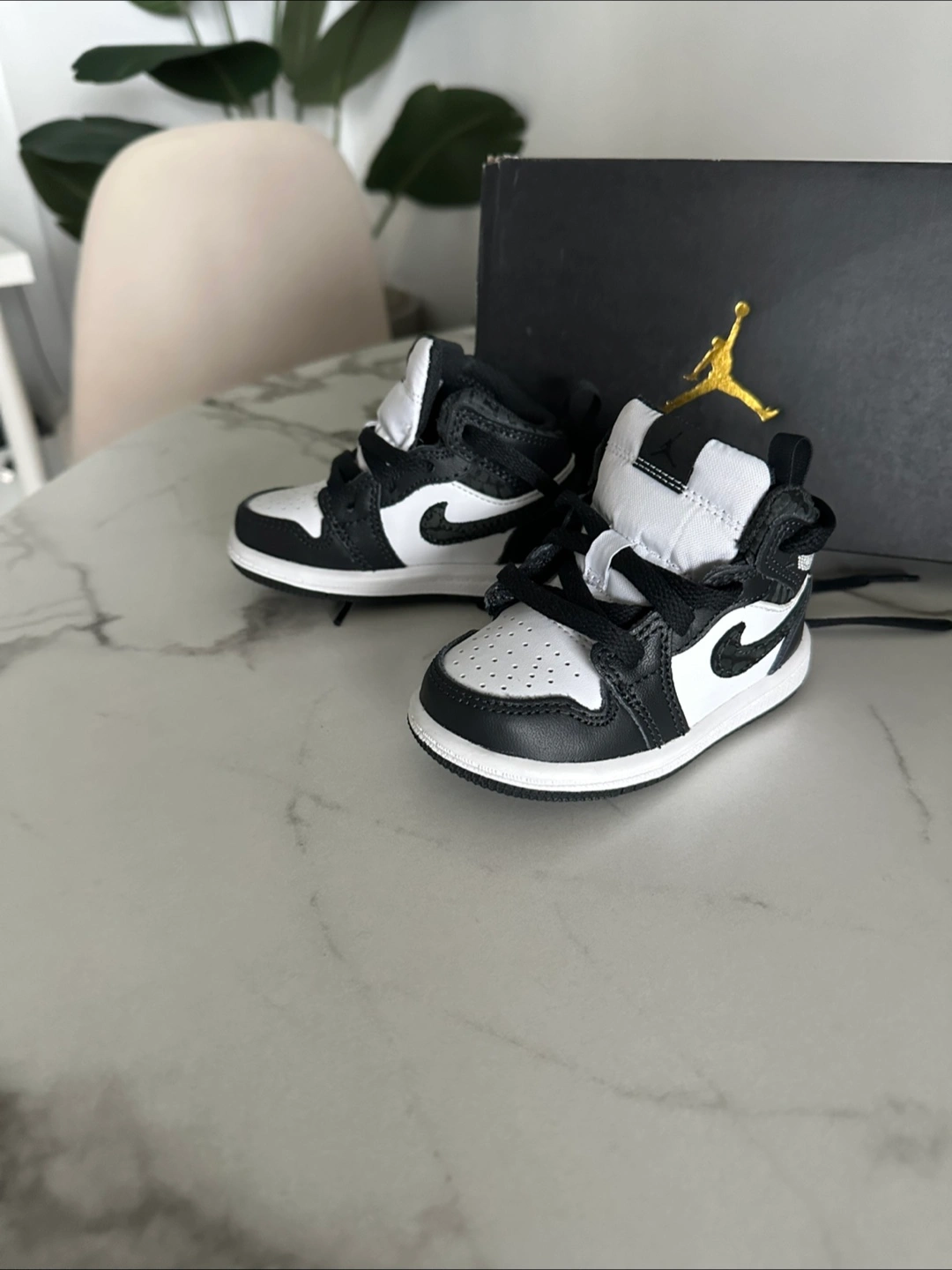 Selling a pair of Jordan 1 Mid SE (TD) toddler shoes in size 5C. These come in a classic black and white colourway. The original box is included!