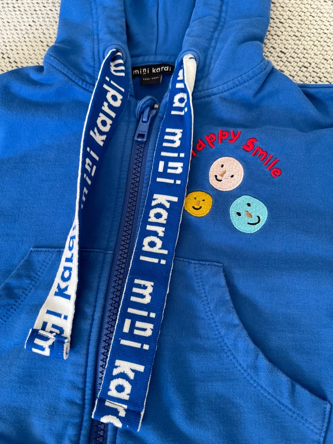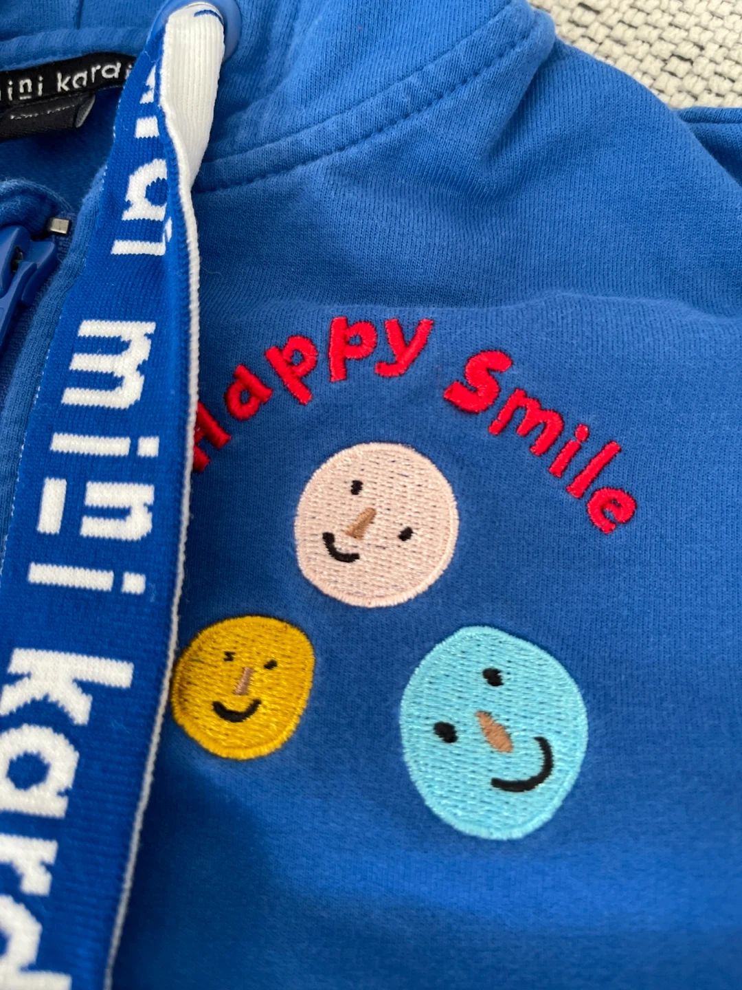 This is a cute blue zip-up hoodie from Mini Kardi featuring "Happy Smile" embroidery. It's made of soft cotton for comfort. This hoodie would be great for everyday wear for a little one!