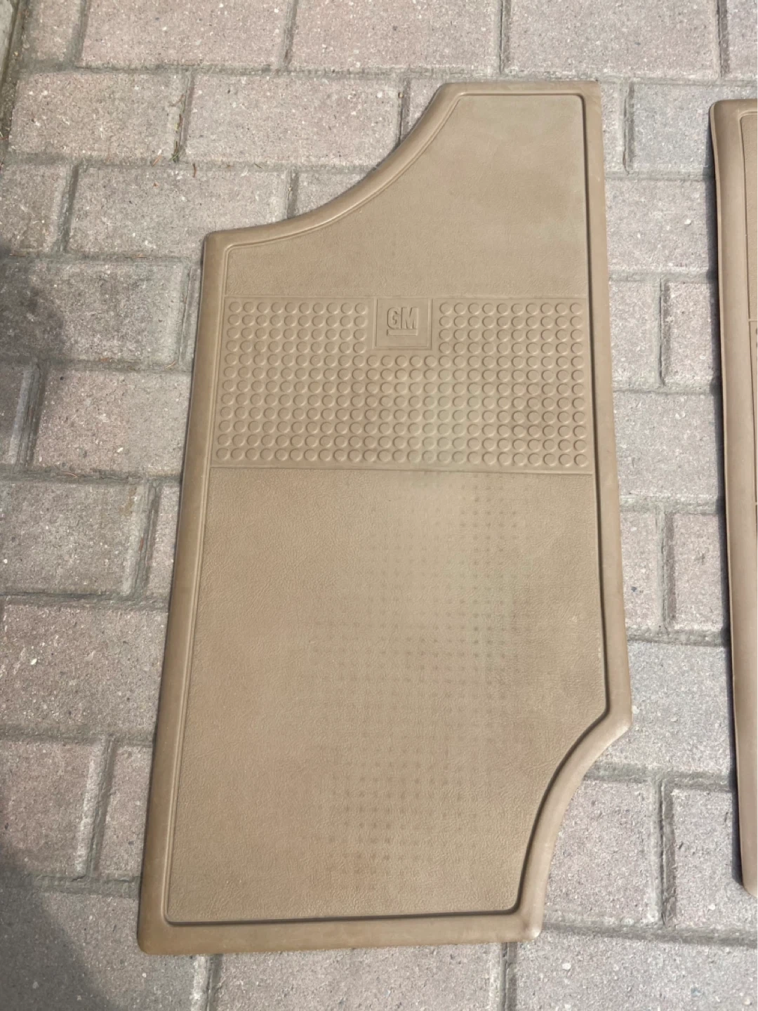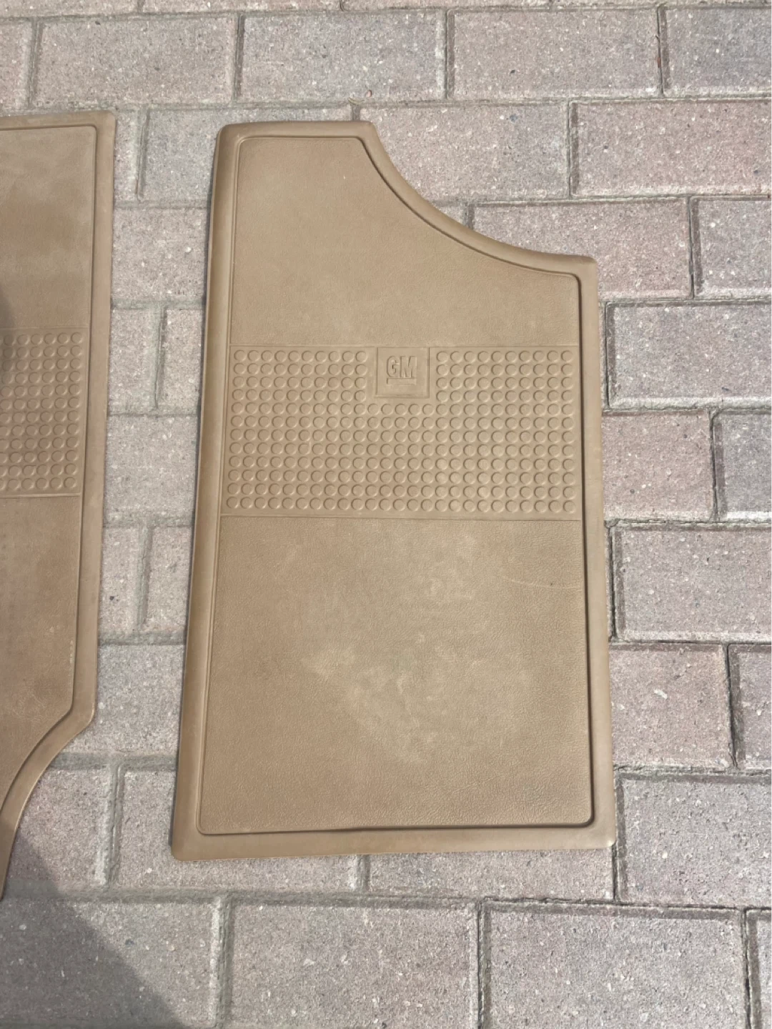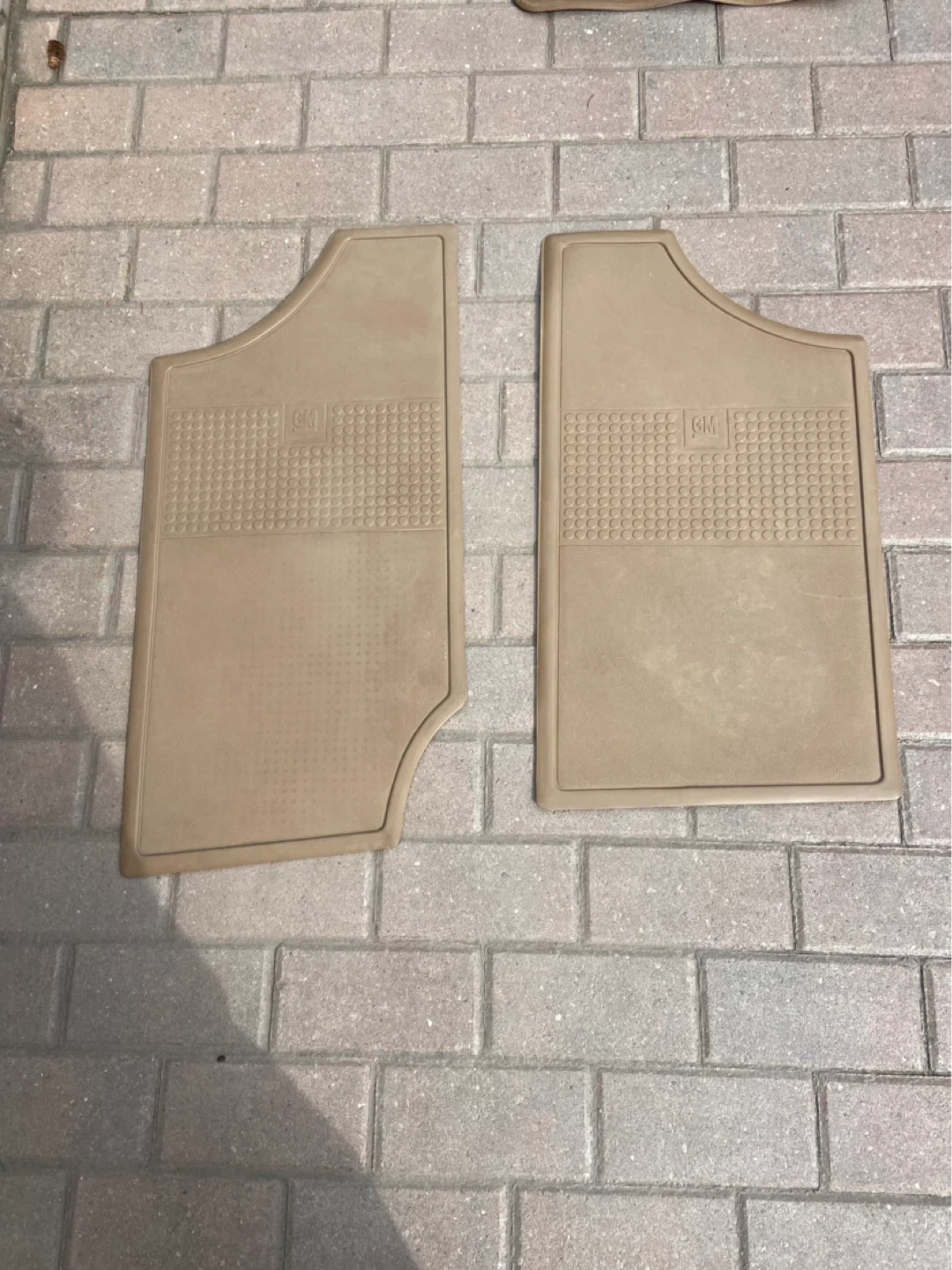 Set of two beige GM car floor mats. They're made of rubber material with a textured pattern. Suitable for protecting your vehicle's carpet.