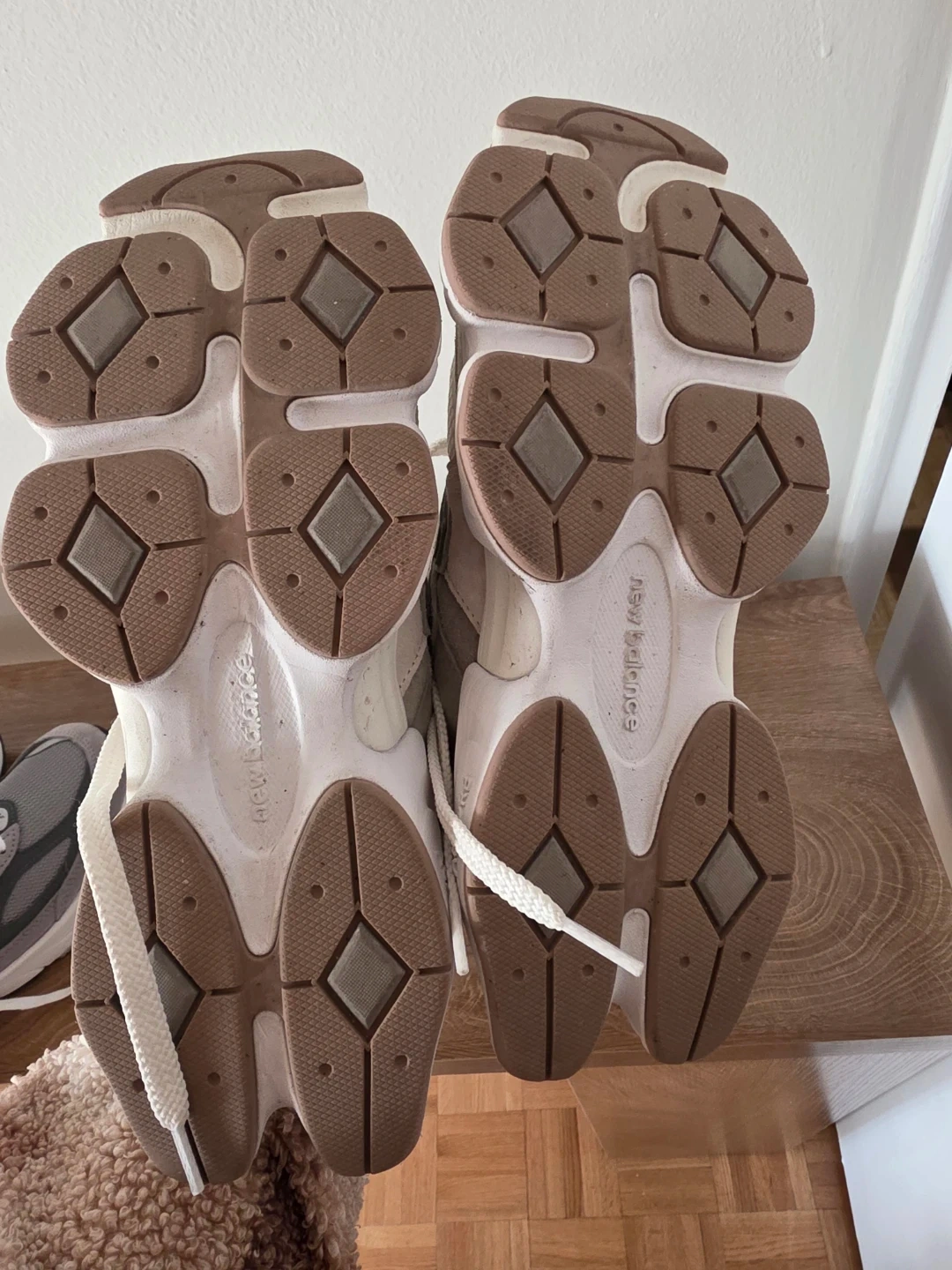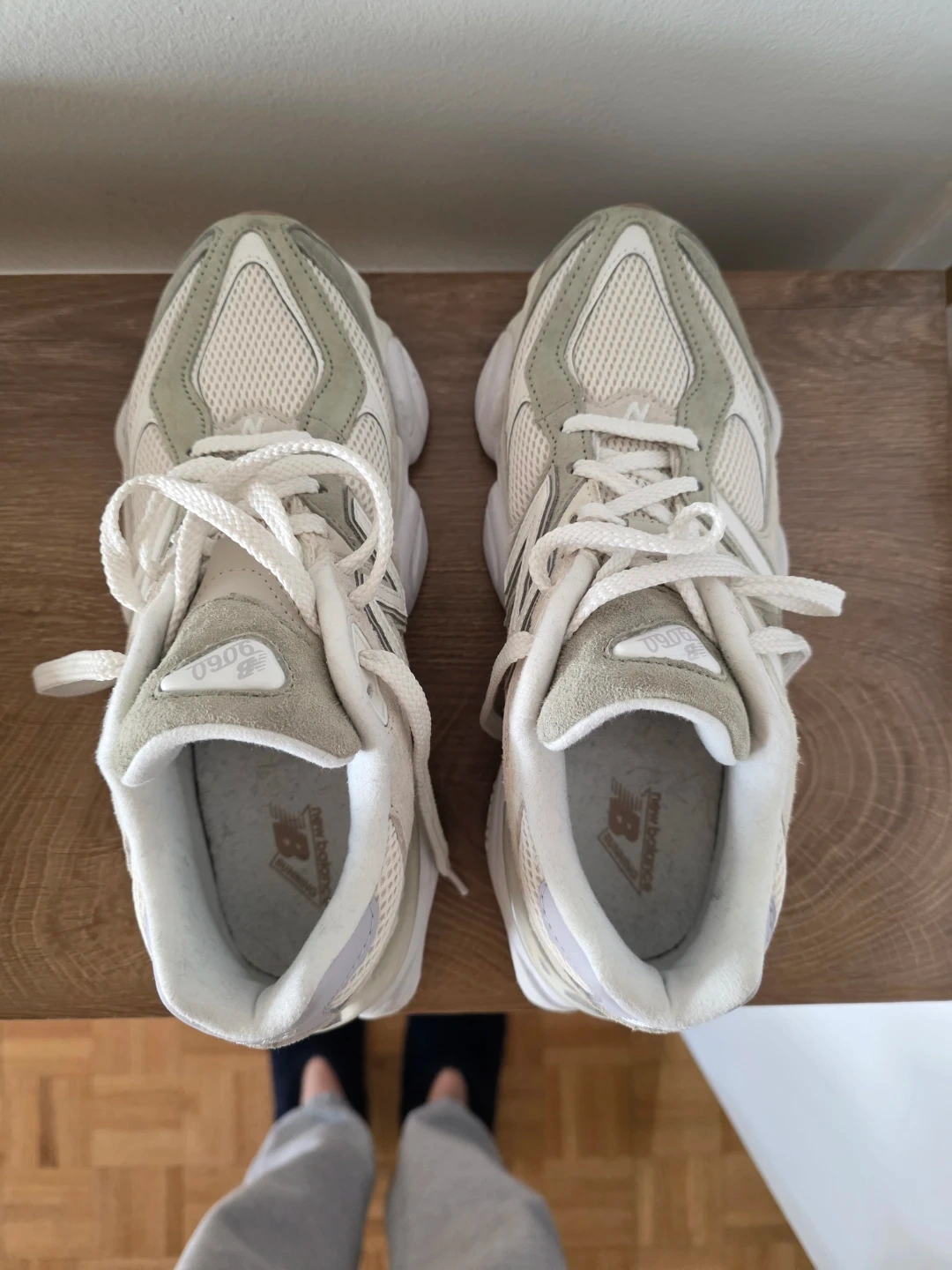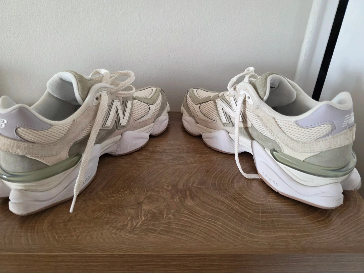 New Balance 9060 lifestyle sneakers in a light olive and cream colour.