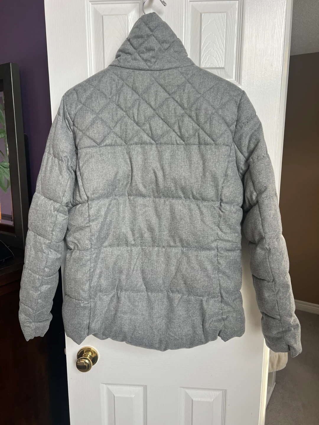 Grey Old Navy puffer jacket. It's a size large and features a quilted design with a full zip closure. The inside is lined with soft fleece for extra warmth.