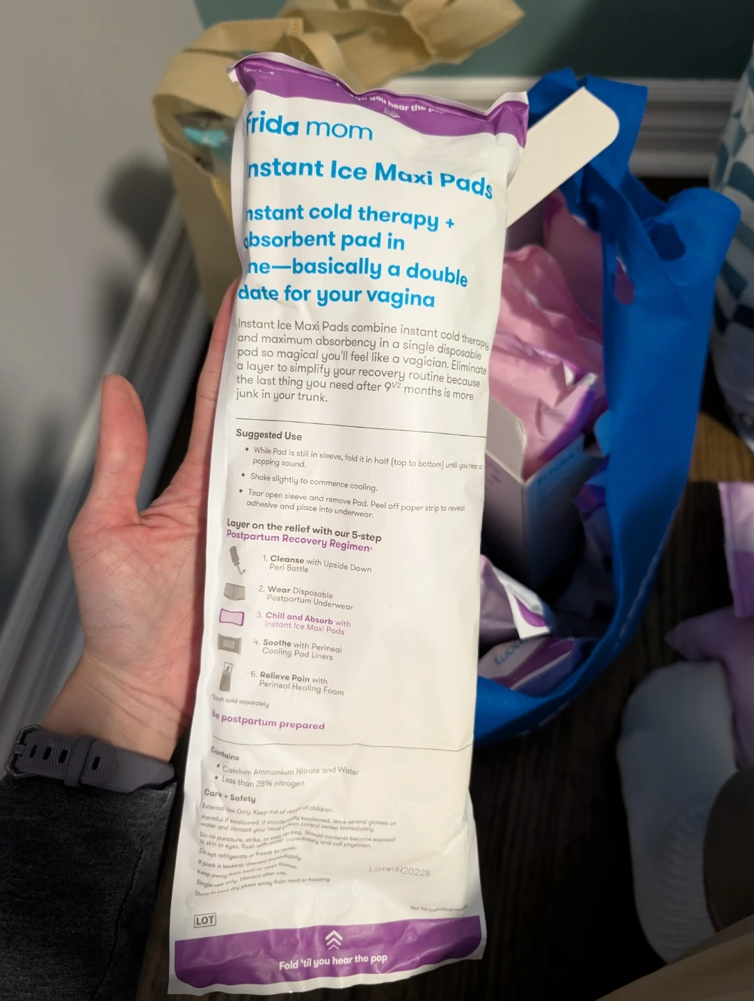 Frida Mom Instant Ice Maxi Pads provide instant cold therapy and absorbency. These pads combine a double date for your vagina in a single disposable product. They're designed for postpartum recovery, offering a soothing layer.