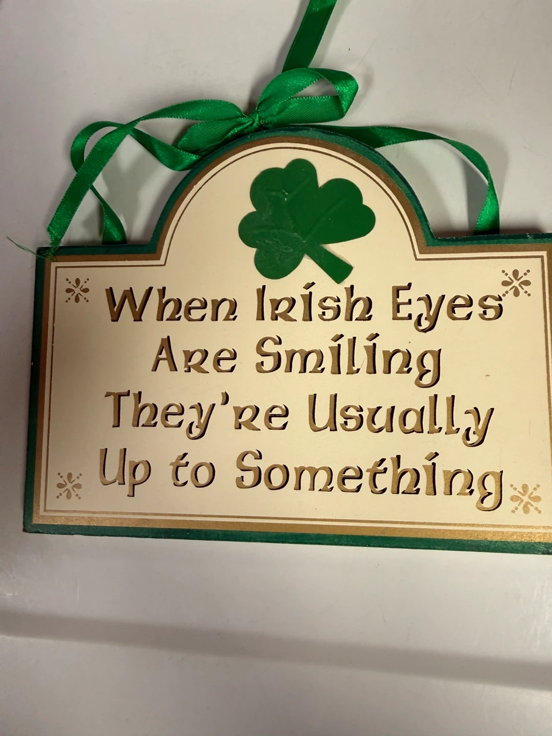 Wooden decorative sign with a St. Patrick's Day theme. It reads 'When Irish Eyes Are Smiling They're Usually Up to Something' and features a shamrock. A green ribbon is attached for hanging. This sign is perfect for adding a festive touch to your home during St. Patrick's Day celebrations!