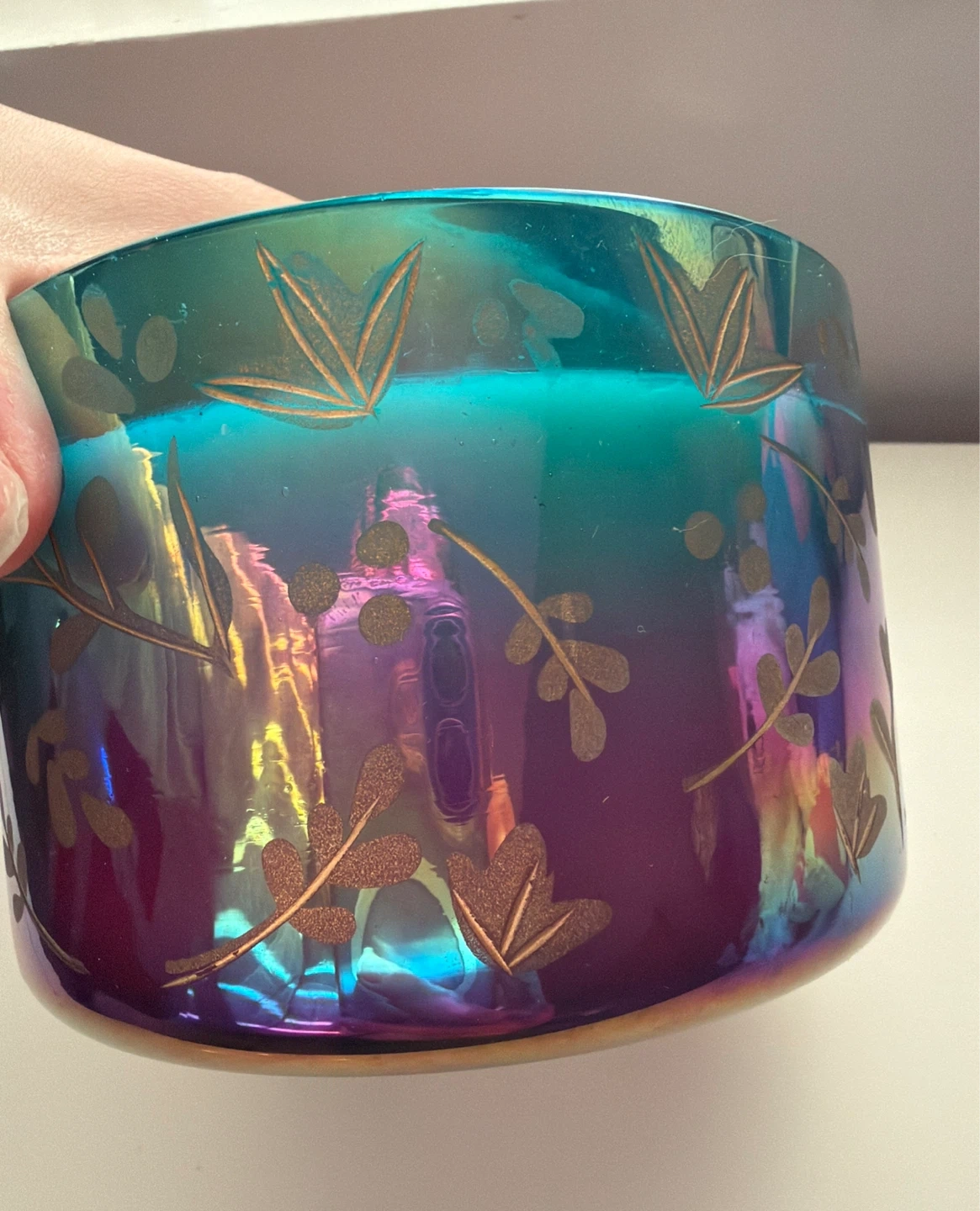 This Anthropologie "Peony Blush" scented candle features a multi-hued glass jar with a botanical design. It's a three-wick candle with notes of lemon & blackcurrant, fresh peony & rose, vetiver & amber. The jar has a colourful iridescent finish.