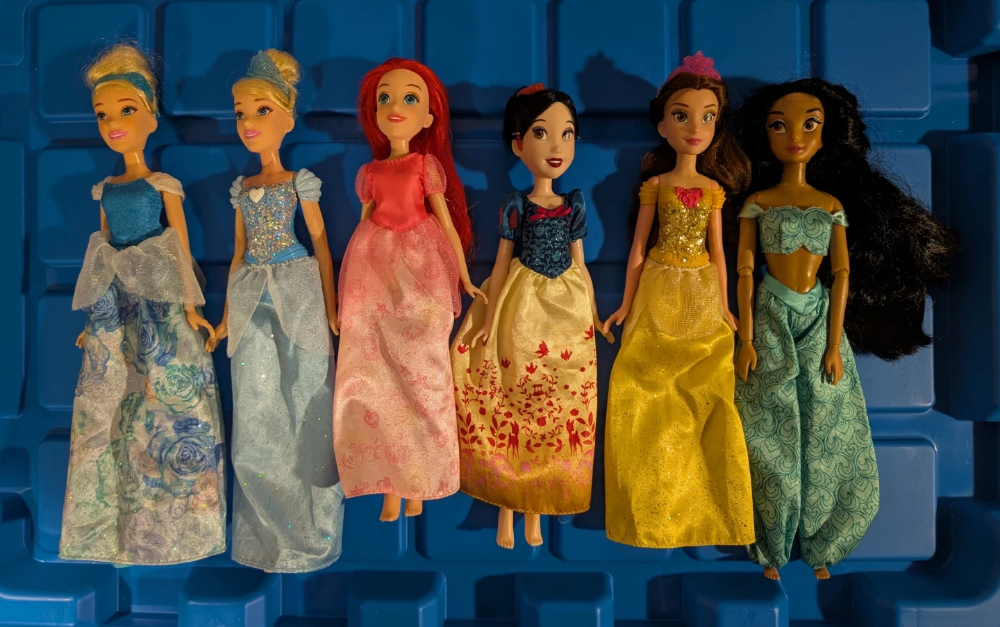 Disney Princess dolls featuring Cinderella, Ariel, Snow White, Belle, and Jasmine. Dolls have articulated arms and legs. Princess dresses are detailed and colourful. Asking $5 each