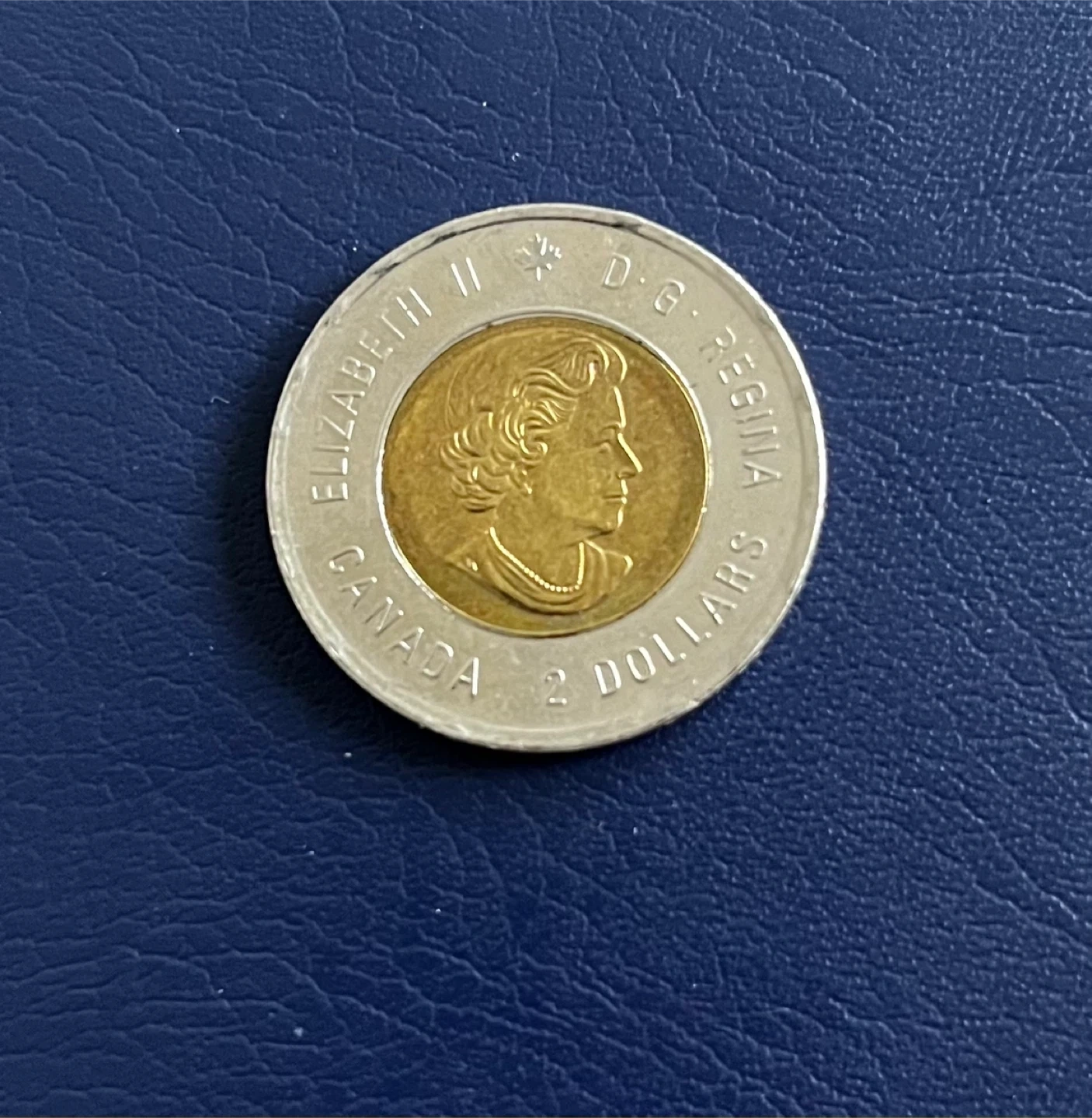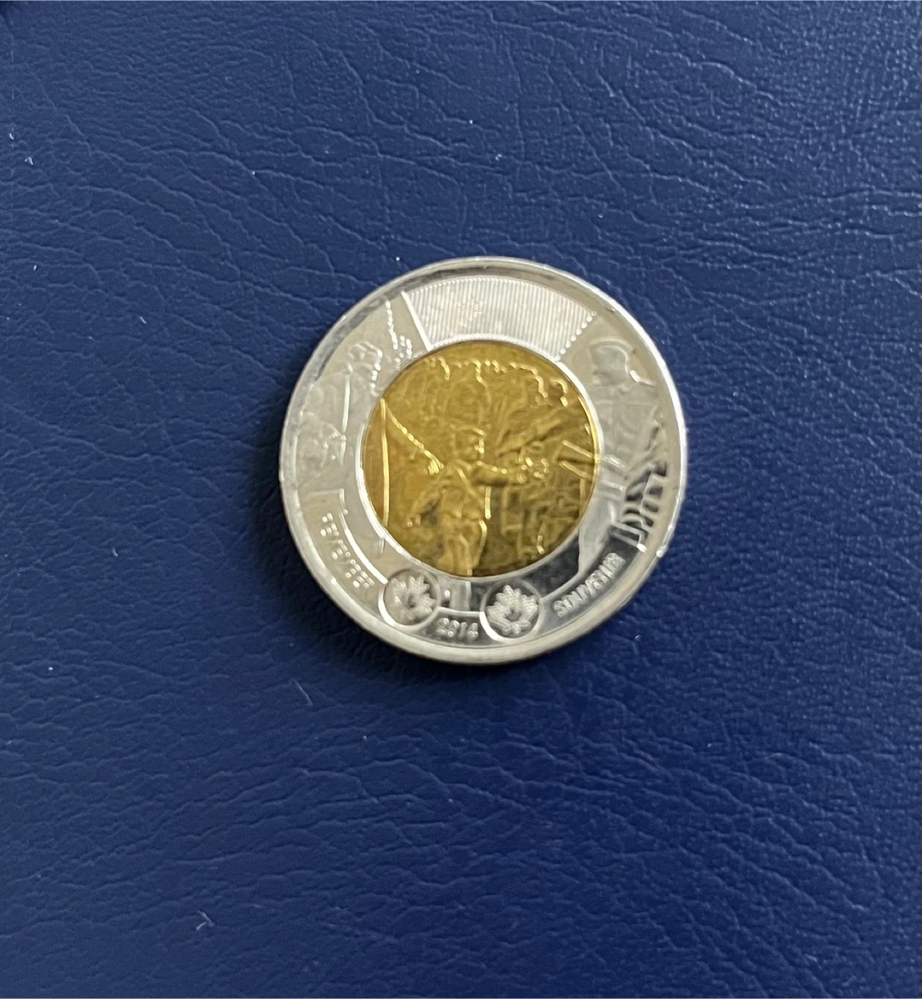 This is a Canadian $2 coin from 2014 commemorating the "Farewell WWII". It features a bimetallic design with the effigy of Queen Elizabeth II on one side and a scene related to the war's end on the other. The coin's edge has the inscription "REMEMBER" and "SOUVENIR".