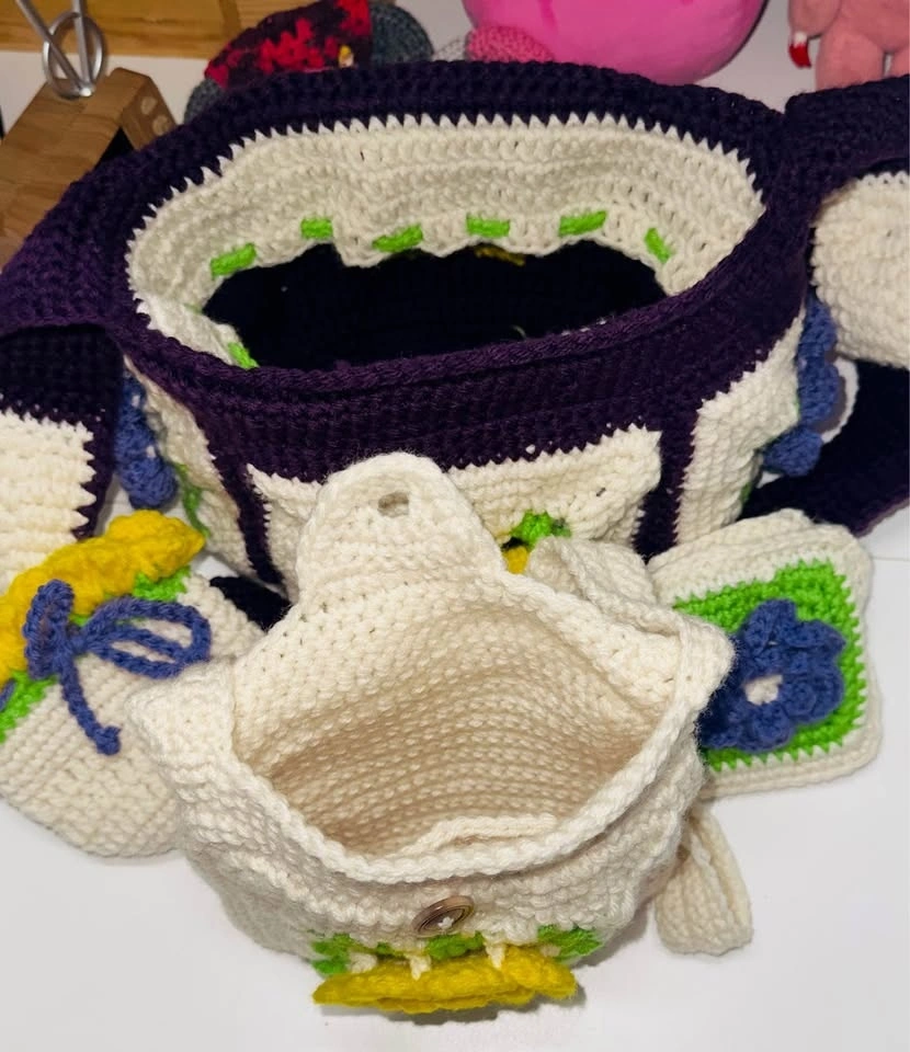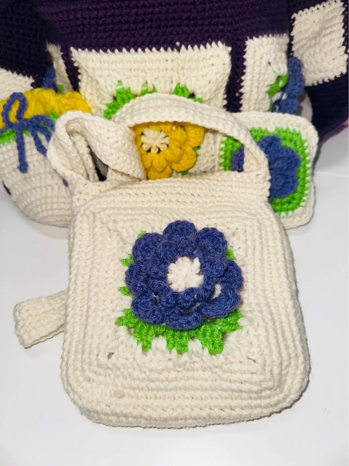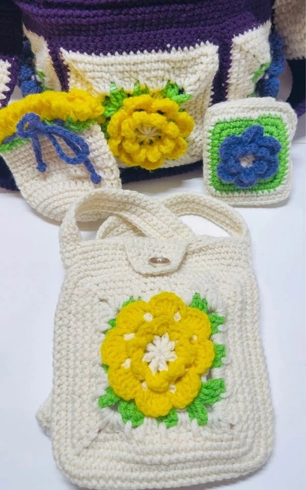 Handmade crochet purse set, featuring a spacious shoulder bag with a secure pull-string closure, a smaller purse with a sleek button closure, and a matching wallet and coin pouch with a convenient pull-string closure.