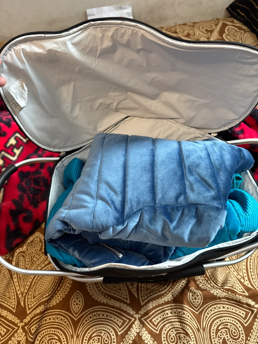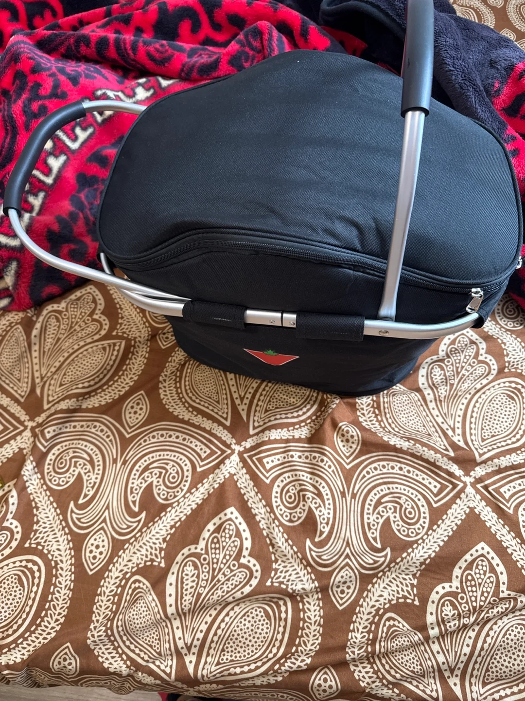 Black insulated picnic basket with aluminum frame and handles. It has a zippered top closure and a red triangular logo with a maple leaf. The interior is lined and spacious, suitable for keeping food and drinks cool.