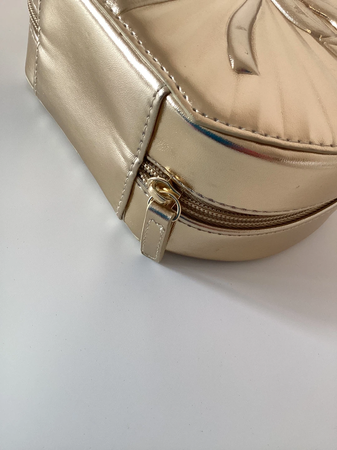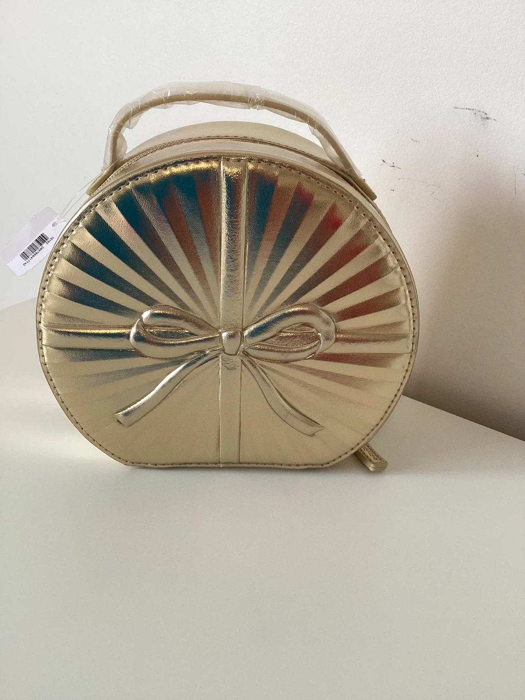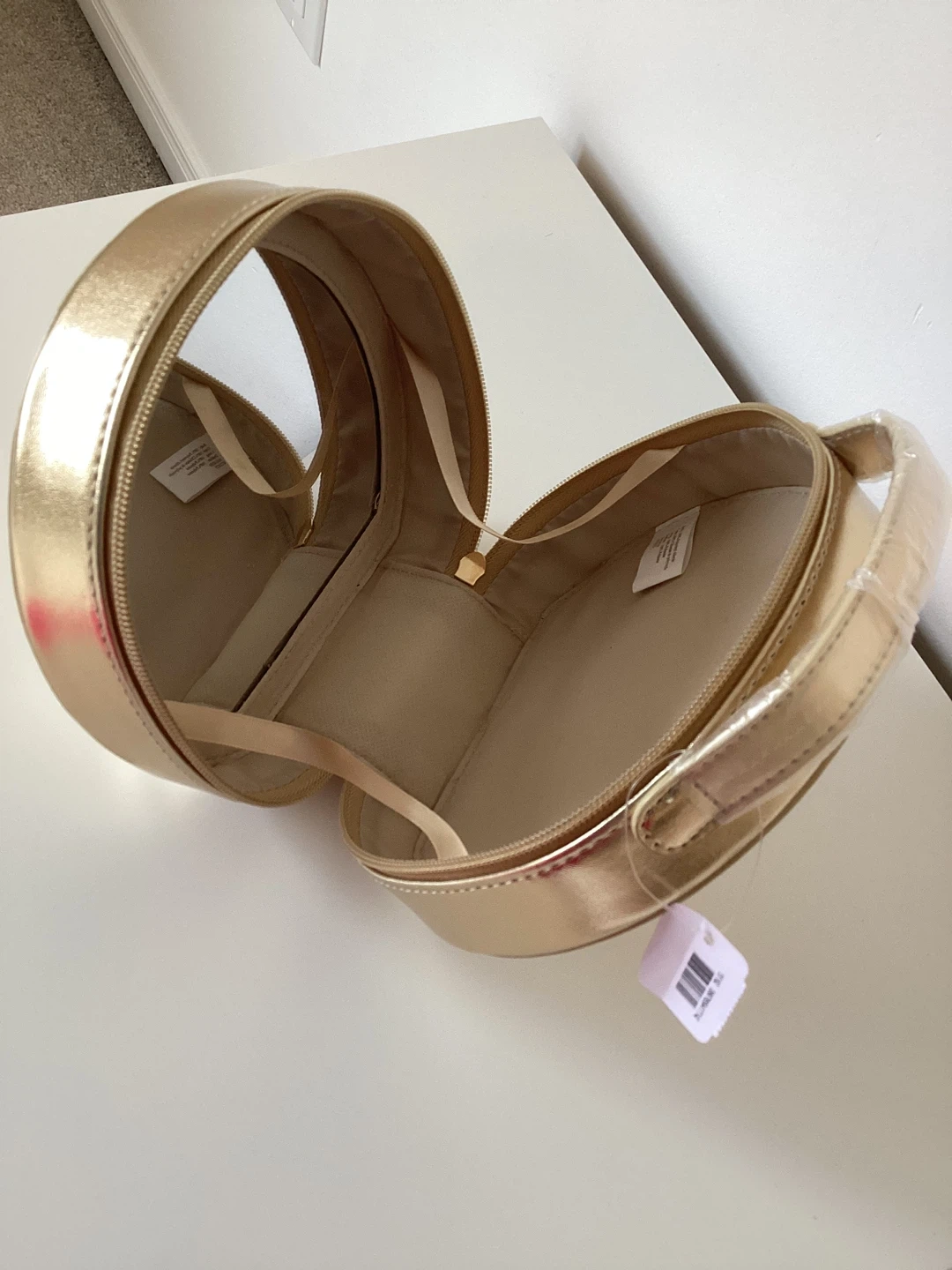 This gold train case is perfect for organizing makeup and accessories. It's a round, compact design with a built-in mirror inside. The case is made of a shiny, faux-leather material. It's ideal for travel or everyday storage!
