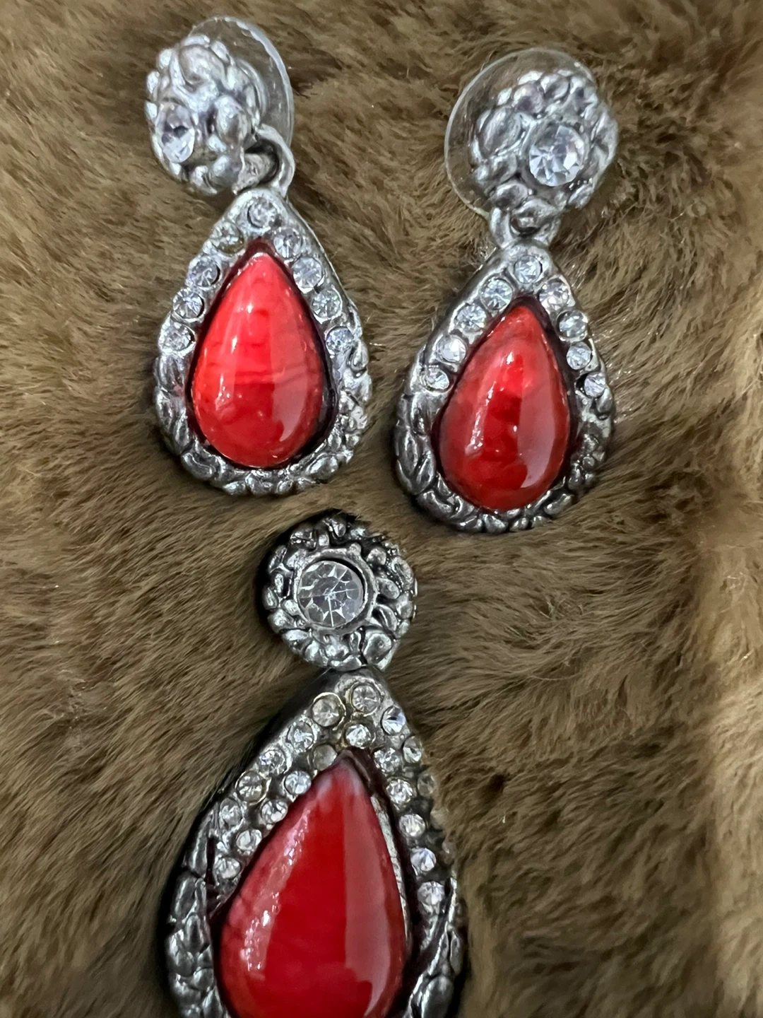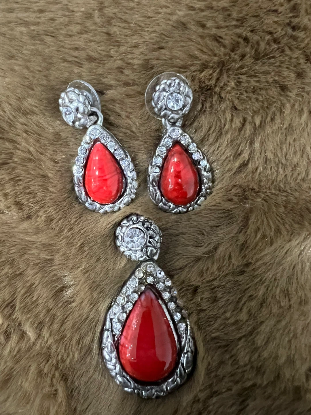 Silver-tone earrings and pendant set with red stones. The set includes a pair of teardrop earrings and a matching pendant. Perfect for adding a pop of colour to any outfit