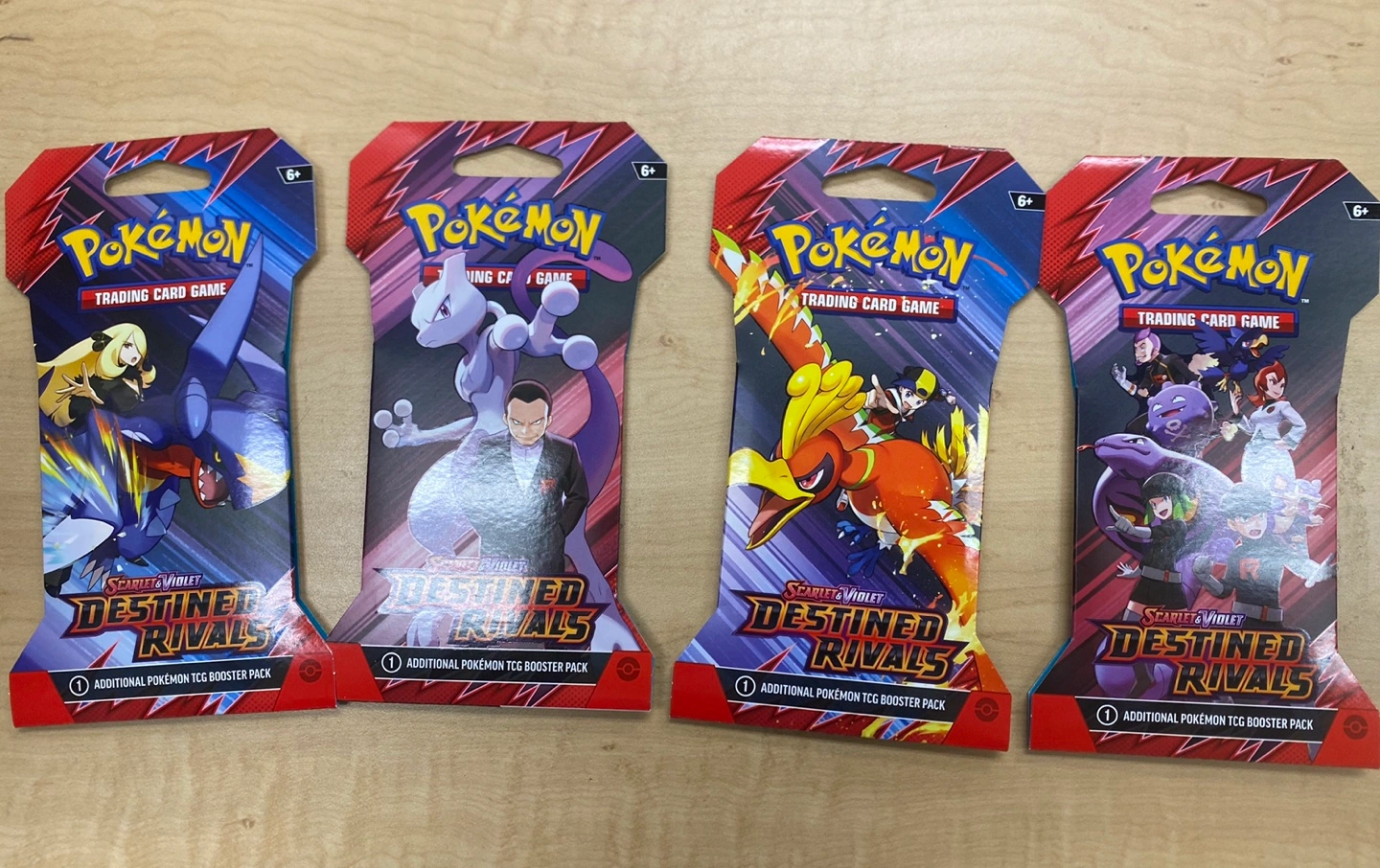 Four Pokemon Trading Card Game booster packs from the Scarlet & Violet: Destined Rivals set. Each pack contains additional Pokemon TCG booster packs.