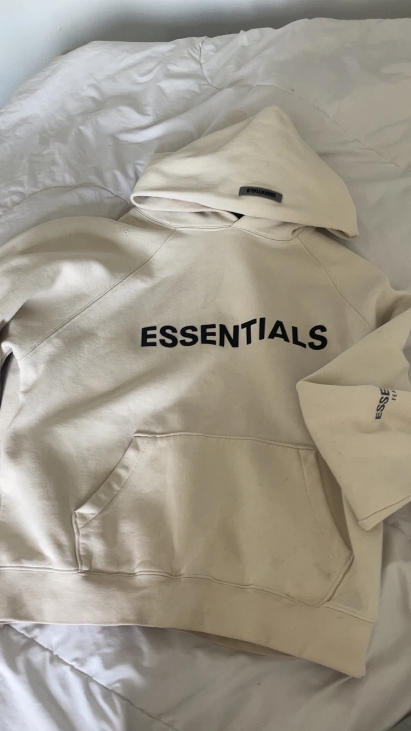 This is a Fear of God Essentials hoodie in a light beige colour. It's made of a soft cotton blend material. It features the "Essentials" logo printed across the chest and a kangaroo pocket. It's a comfortable pullover style.