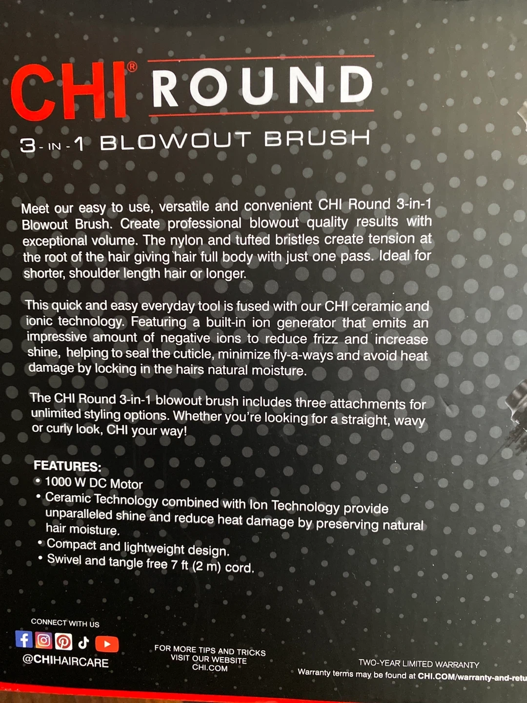 This CHI Round 3-in-1 blowout brush features 1000 W DC motor and ceramic technology combined with ion technology. It includes three attachments for unlimited styling options. Swivel and tangle free 7 ft cord.