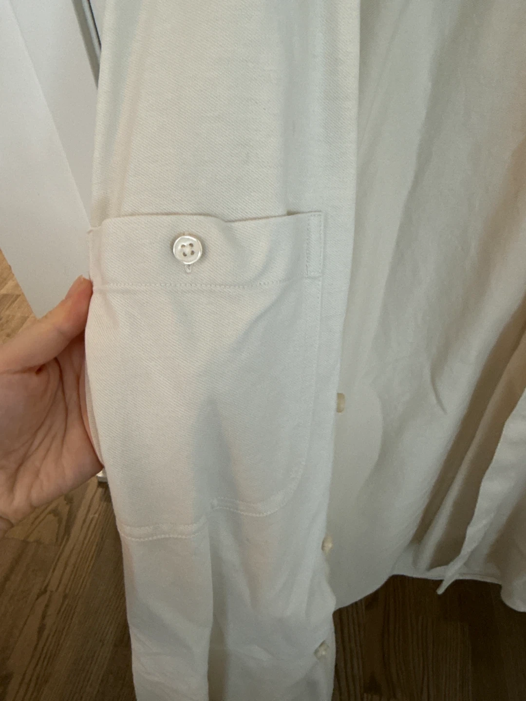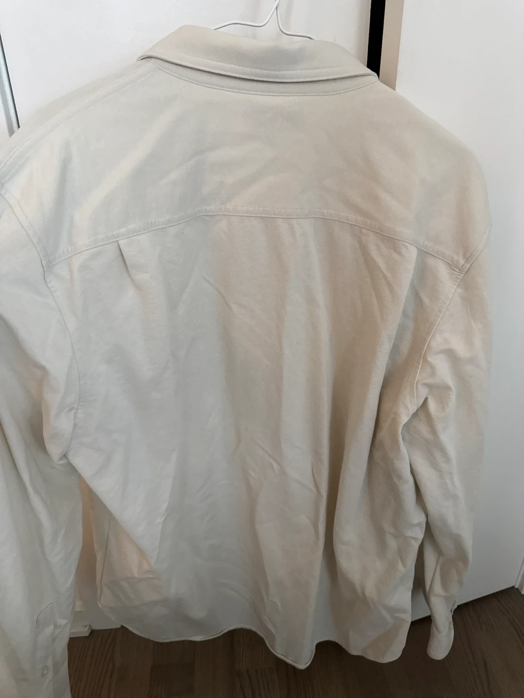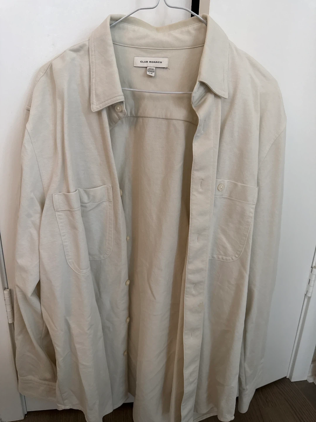This is a long-sleeved button-up shirt from Club Monaco. It features two chest pockets and a classic collar. The size is L/G.