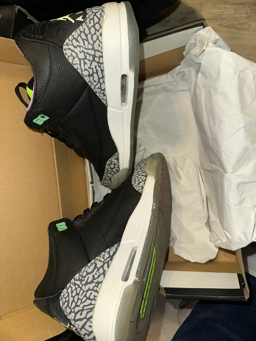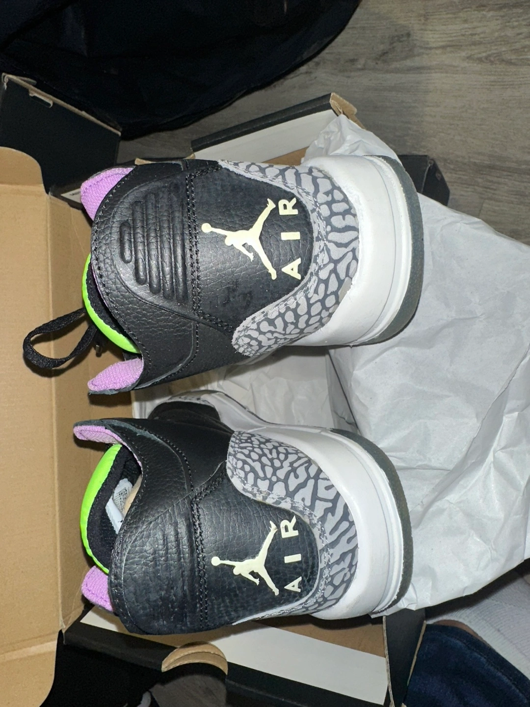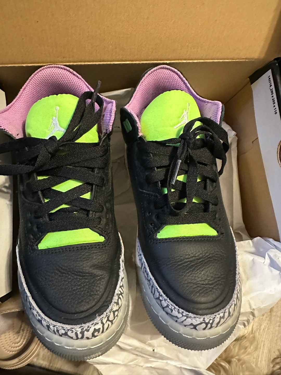 Classic Air Jordan 3 Retro sneakers in black, grey, and neon green with purple accents. These shoes feature a tumbled leather upper with elephant print overlays. Includes original box.