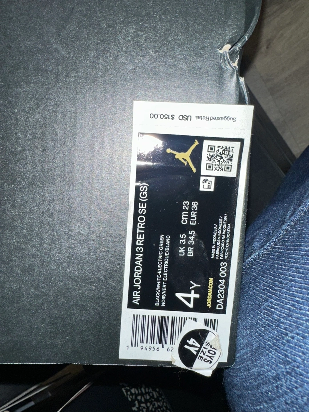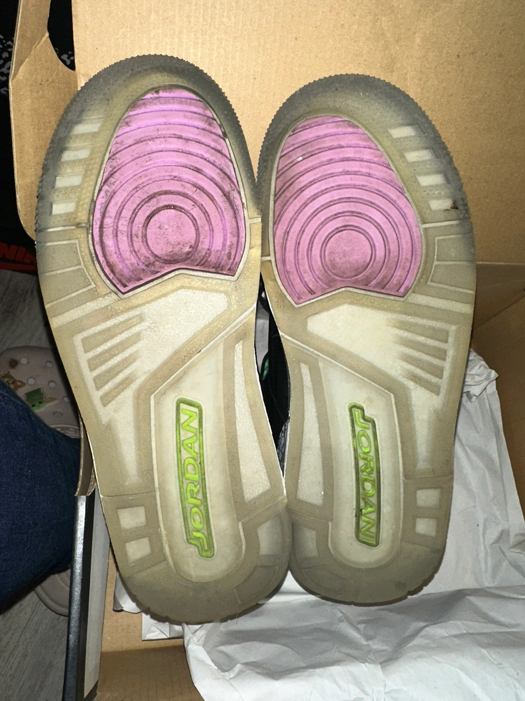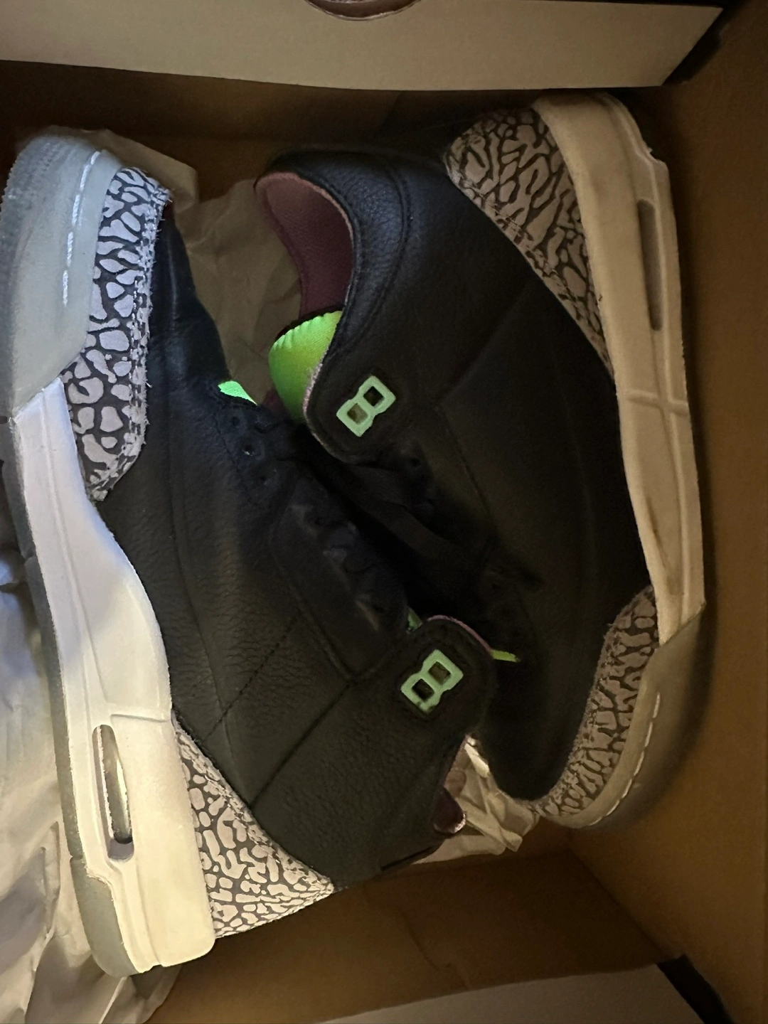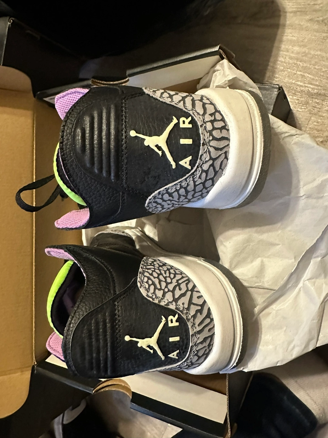 Classic Air Jordan 3 Retro sneakers in black, grey, and neon green with purple accents. These shoes feature a tumbled leather upper with elephant print overlays. Includes original box.