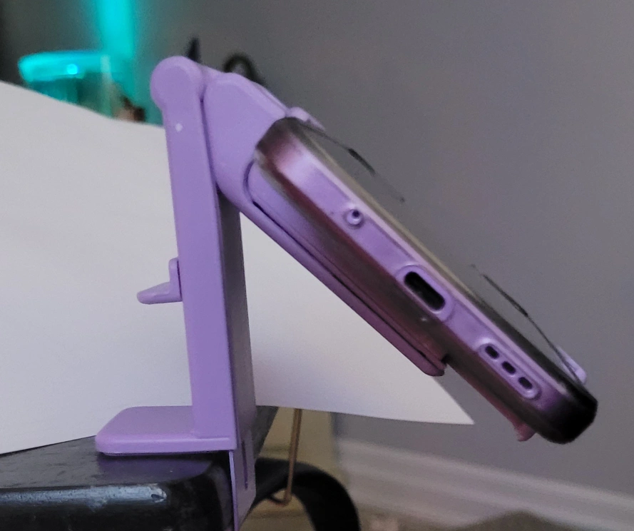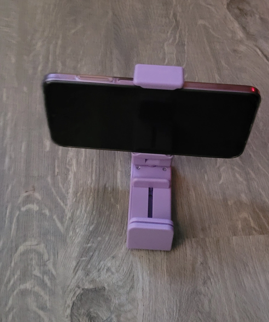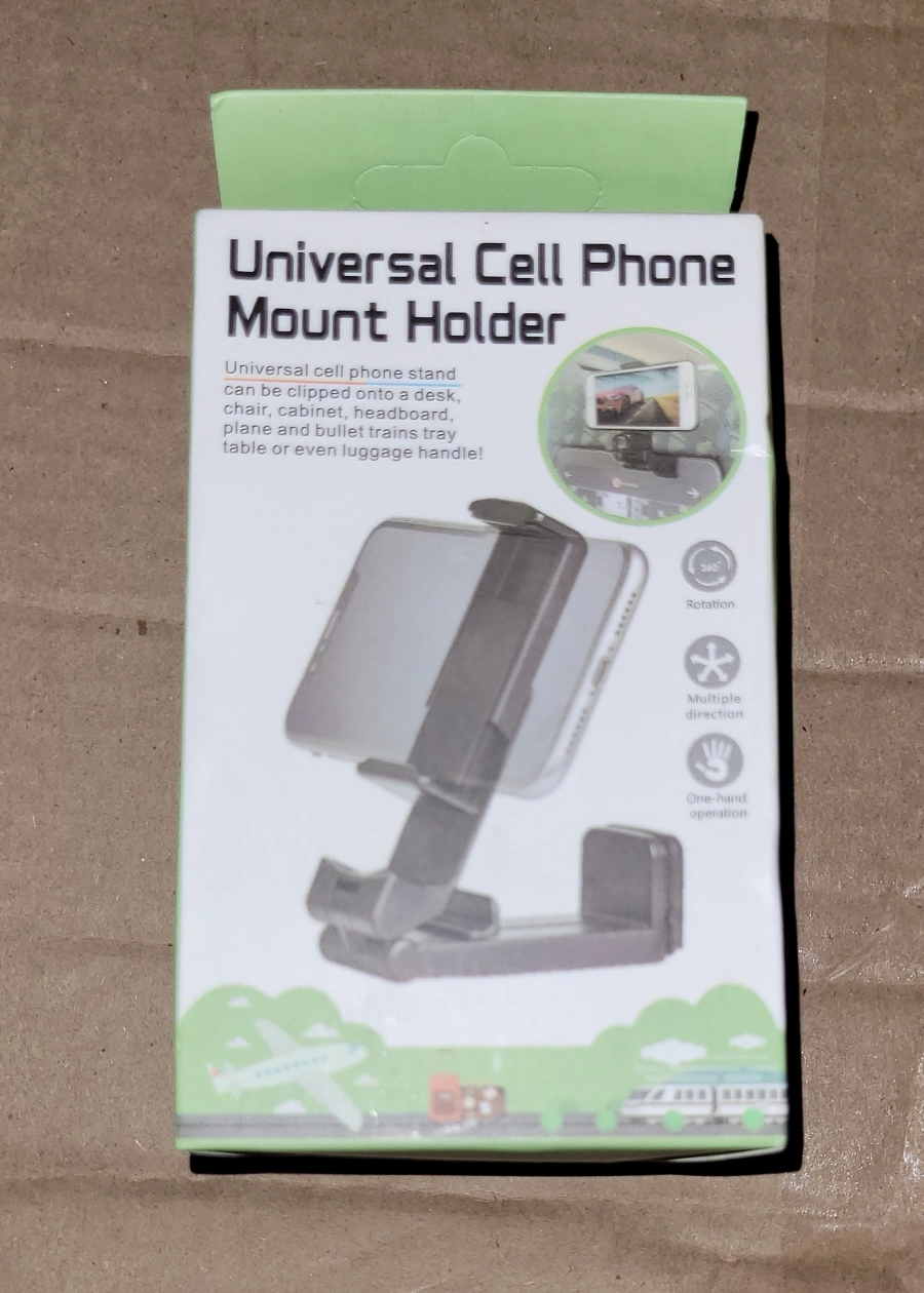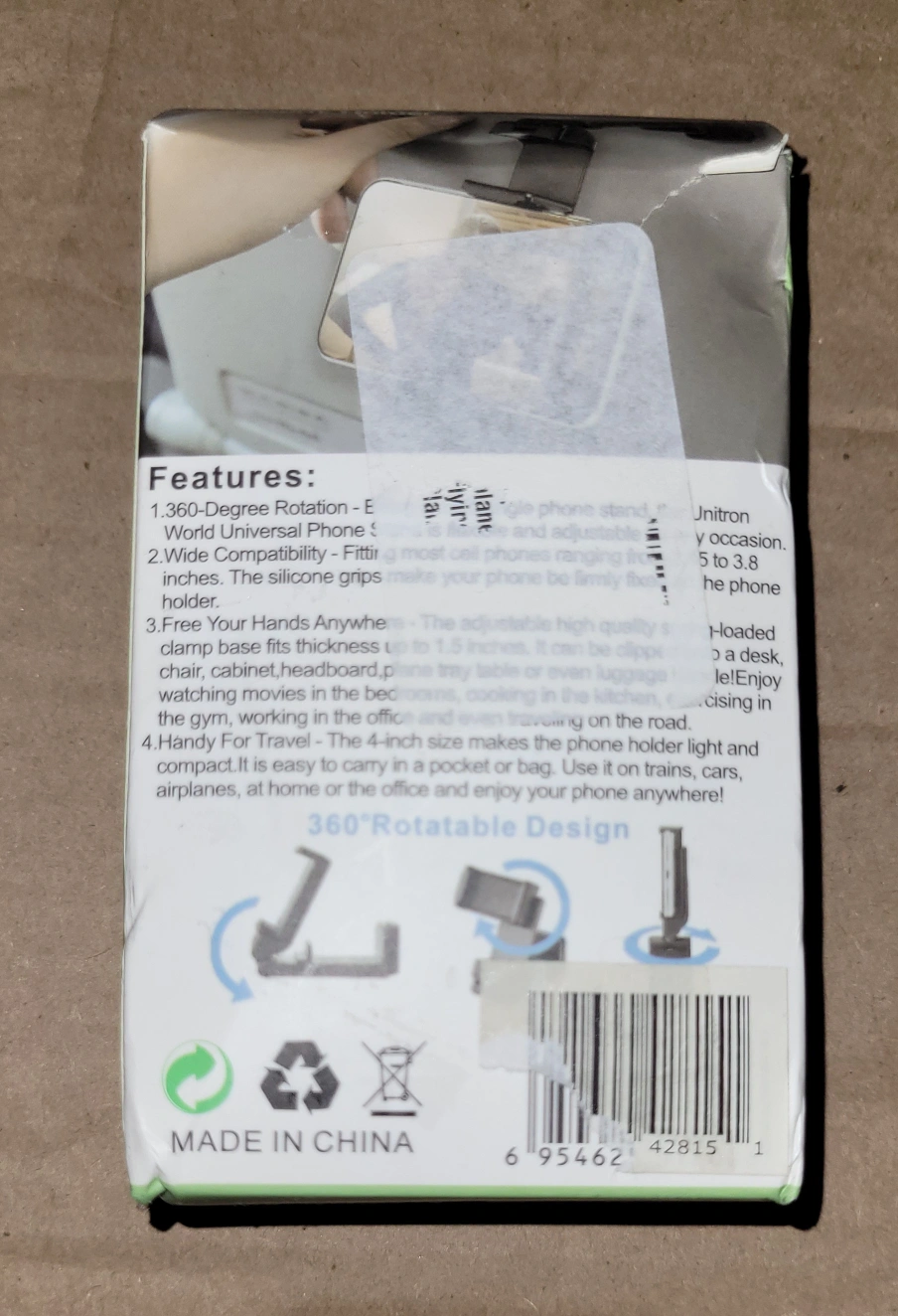 Adjustable phone stand. Clips onto various surfaces. 360-degree rotation. One-handed operation. Compact and portable. Great for watching videos or video calls.