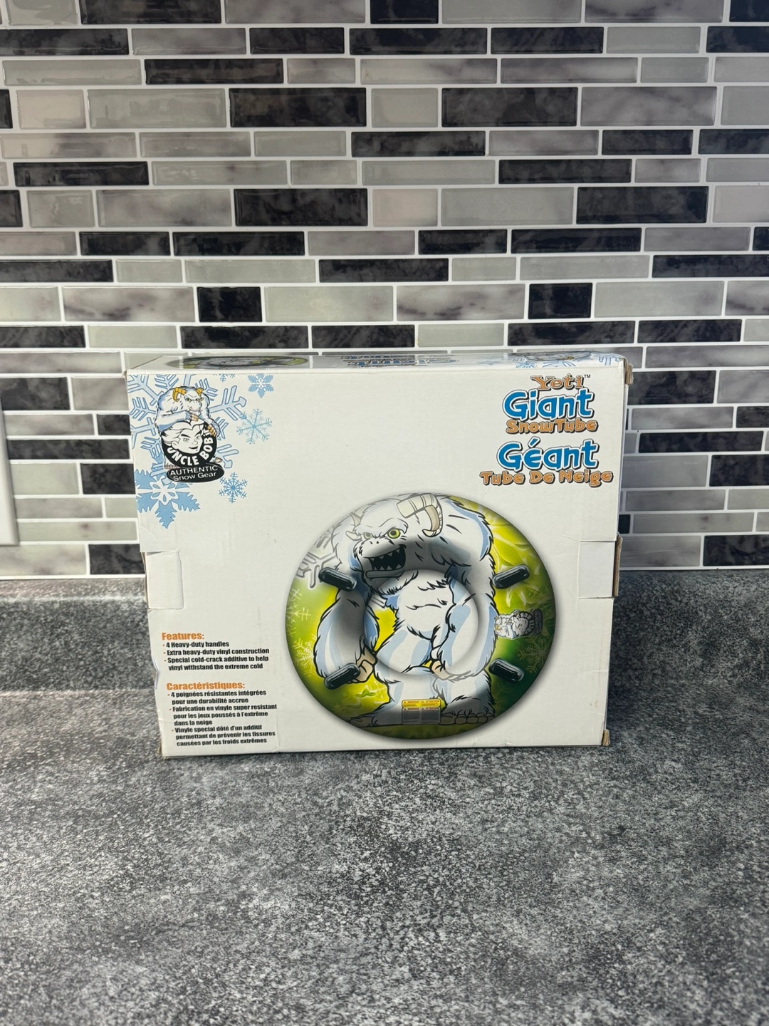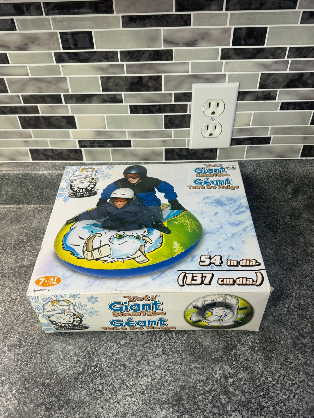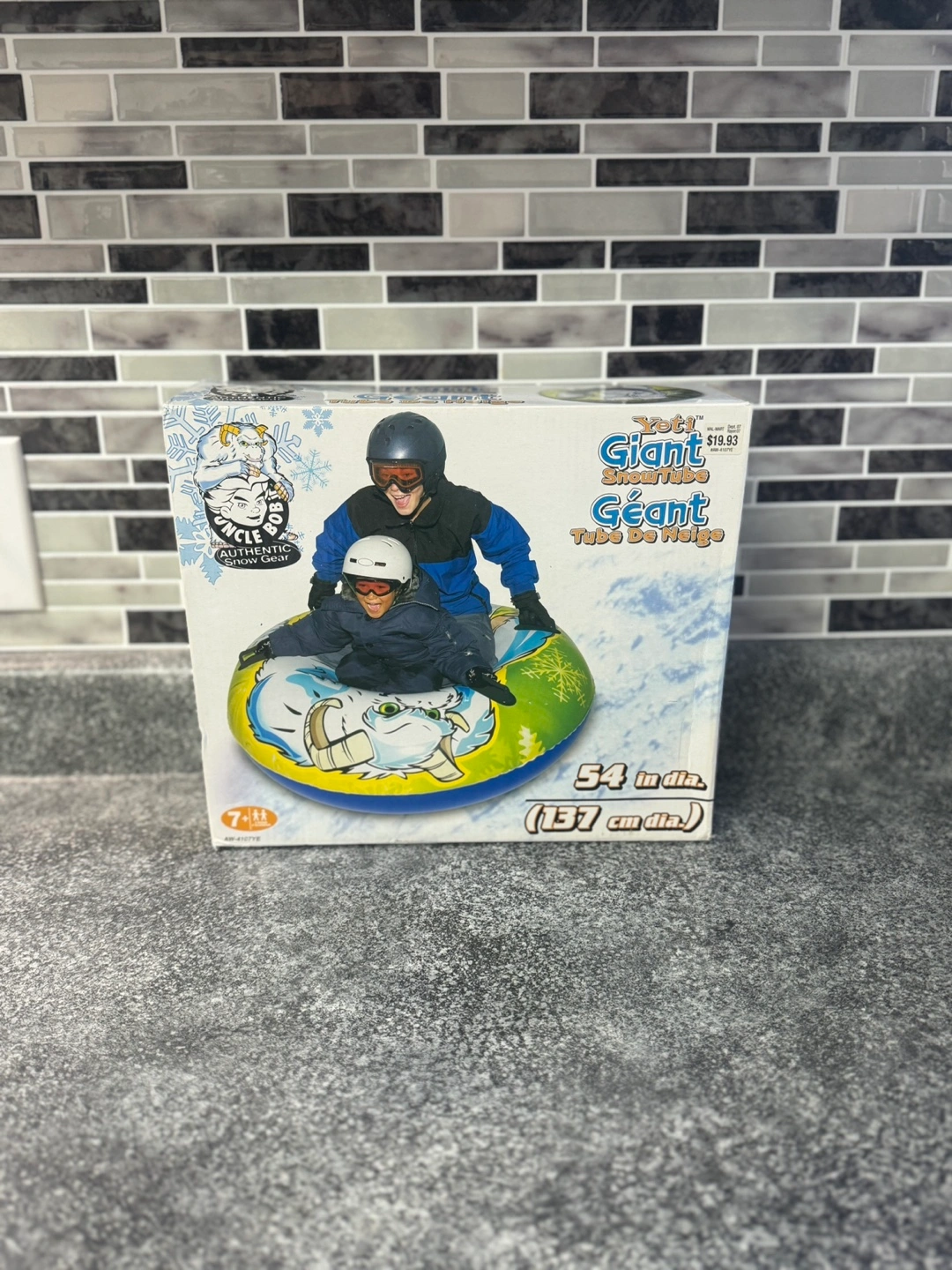Giant snow tube, 54 inches in diameter. Features a 6-ply heavy duty vinyl construction, reinforced with a 2-ply heavy duty vinyl reinforced the extreme cold.