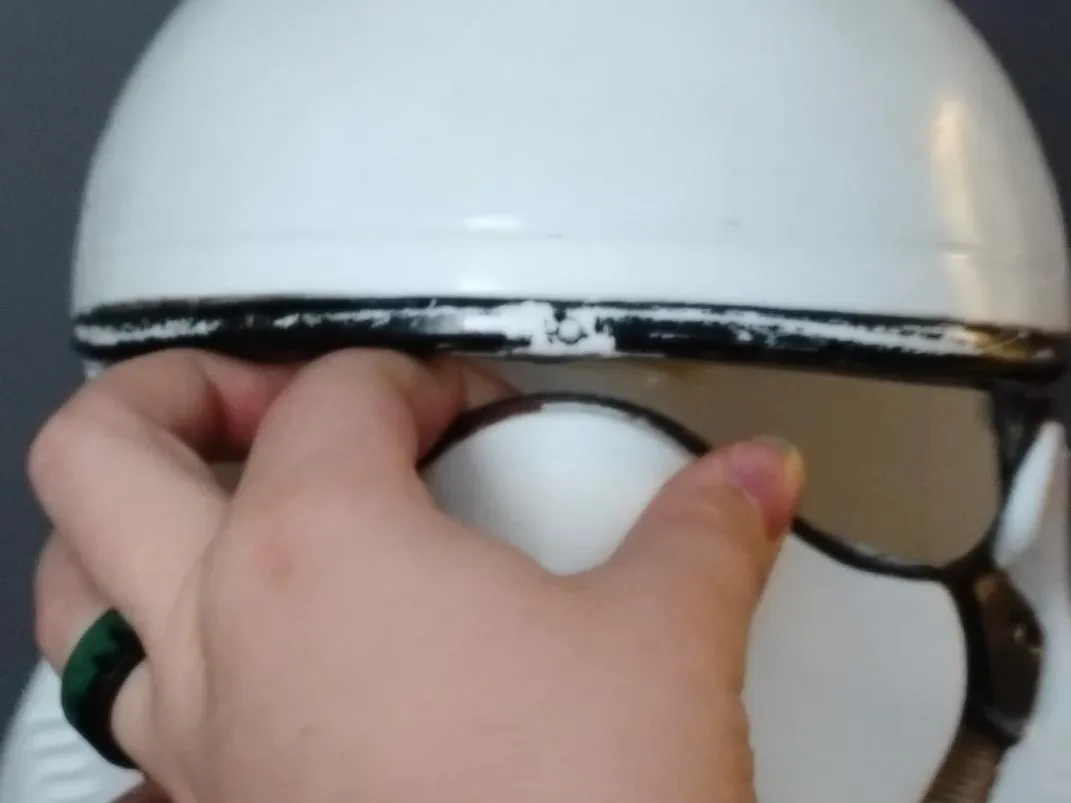 A white Stormtrooper helmet replica, reminiscent of iconic Star Wars characters. It's made of plastic with black trim around the visor. This item is great for fans and collectors!