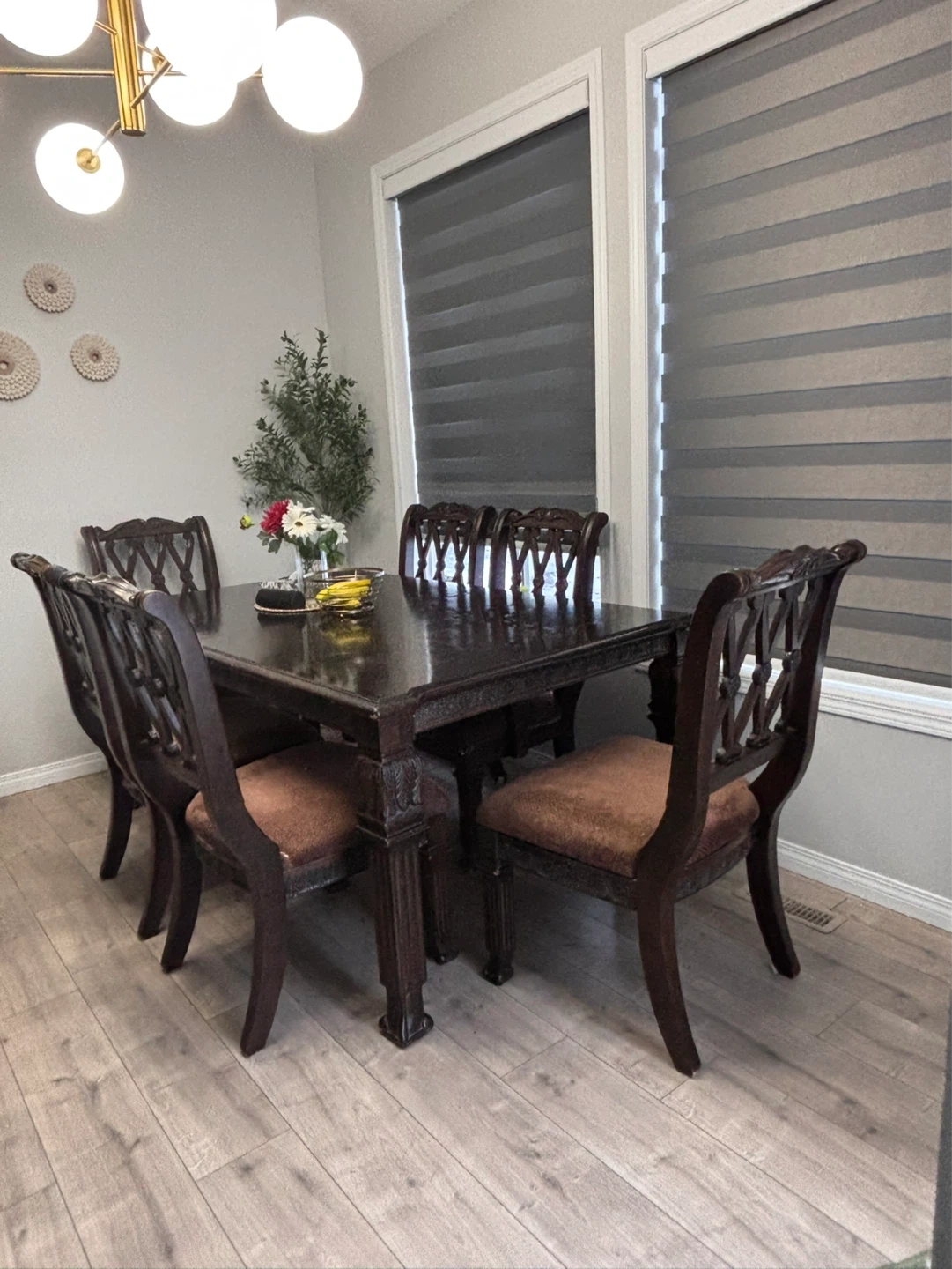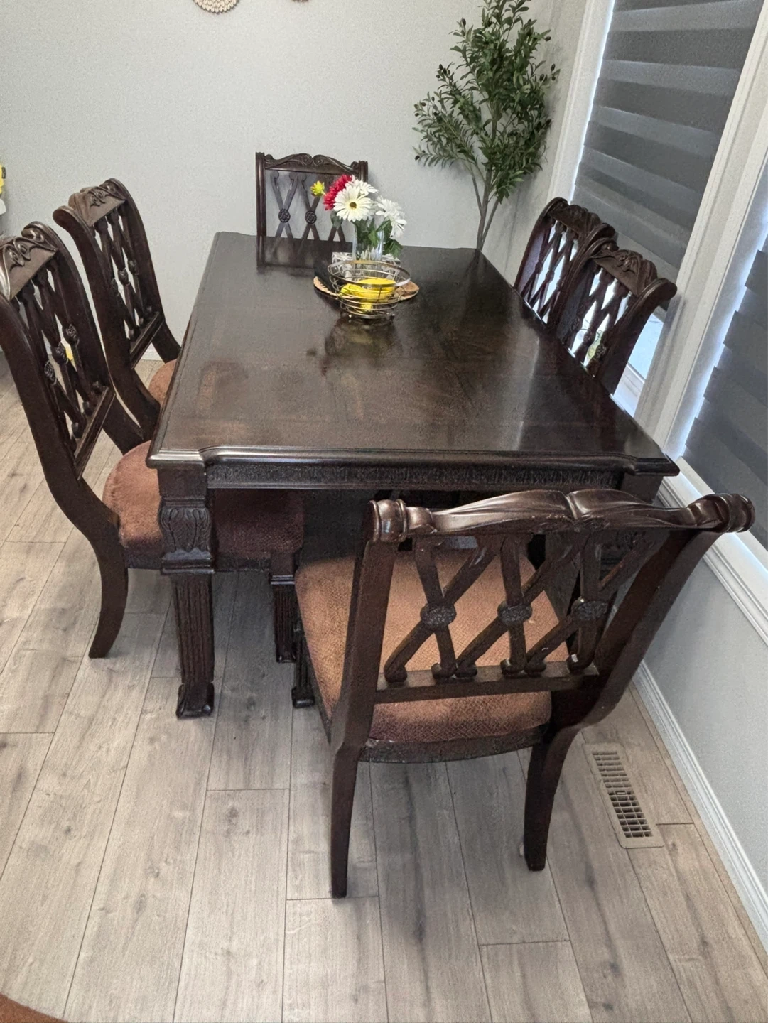 Beautiful and elegant solid wood dining set for sale. This set features a rich dark finish with detailed craftsmanship on both the table and chairs, adding a classic and luxurious feel to your dining space.