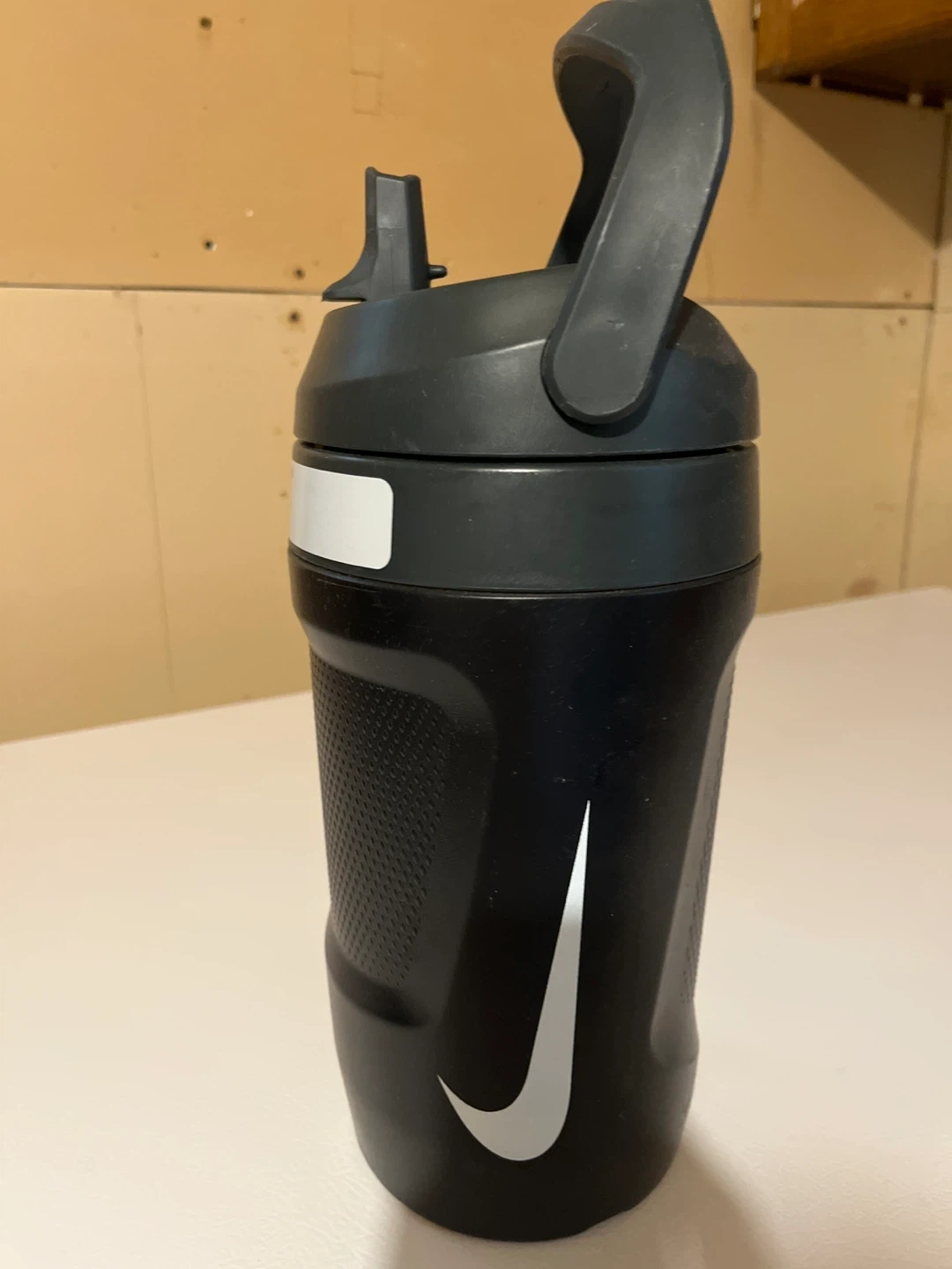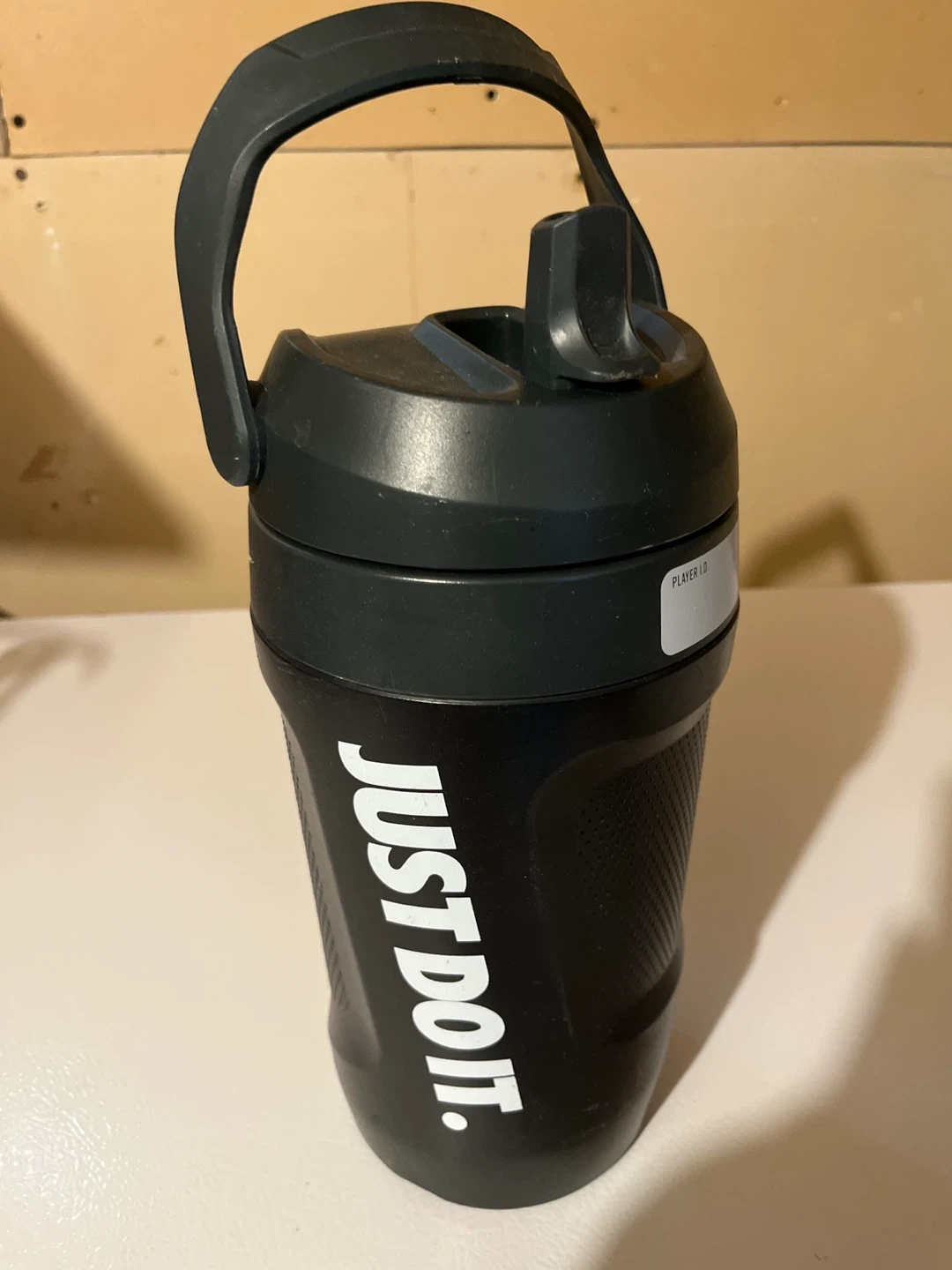 Black Nike shaker bottle with "JUST DO IT." slogan. It has a convenient carrying handle and a flip-top lid. Made of durable plastic. 1.89 L /64 oz CASH only