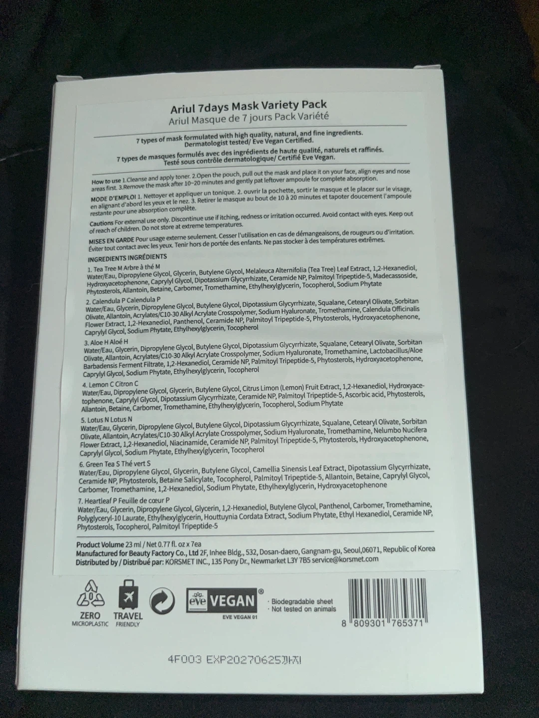 Ariul 7days Mask variety pack features seven masks for different skincare needs. Masks include Green Tea, Tea Tree, Lemon, Heartleaf, Lotus, Calendula, and Aloe. Each mask is 23ml, for a total of 7 masks.