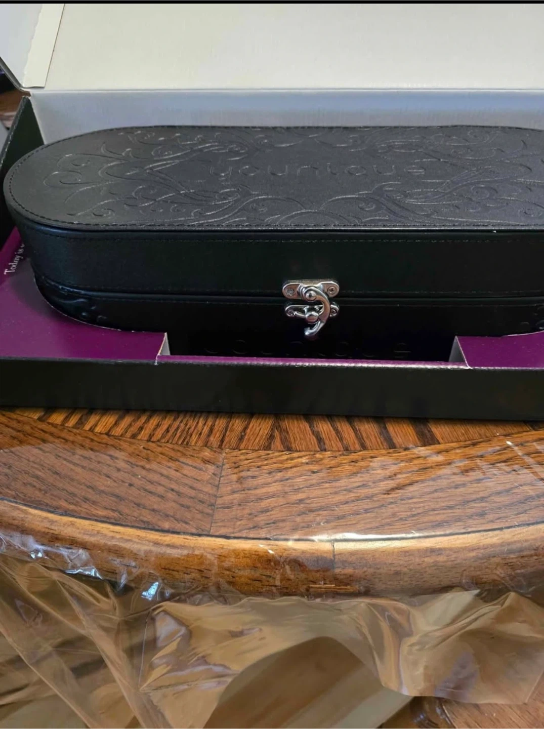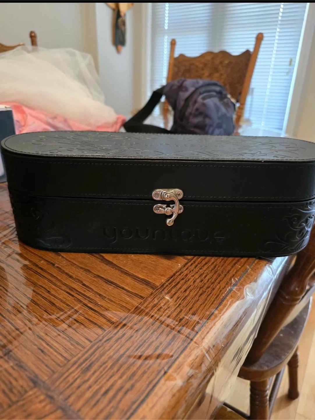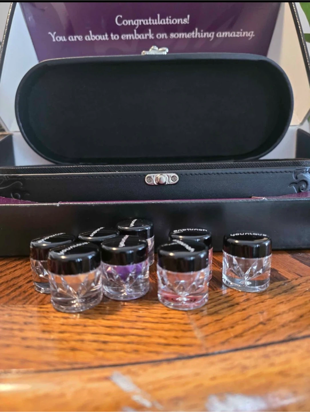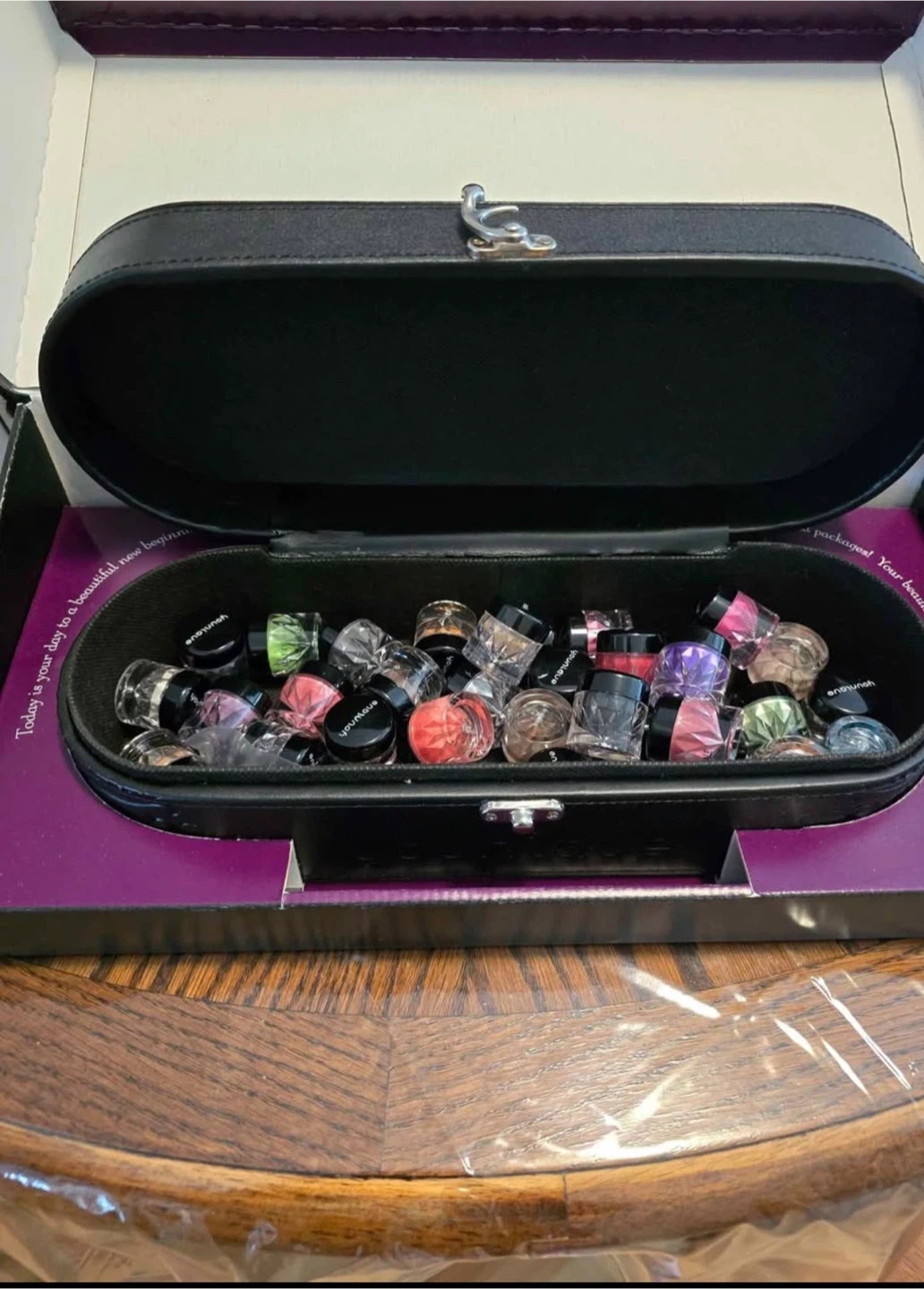 This is a Younique makeup collection featuring multiple eyeshadow palettes housed in a black faux-leather case. The case has embossed detailing and a metal clasp closure. It comes with a variety of vibrant colours. This collection is great for experimenting with different looks!